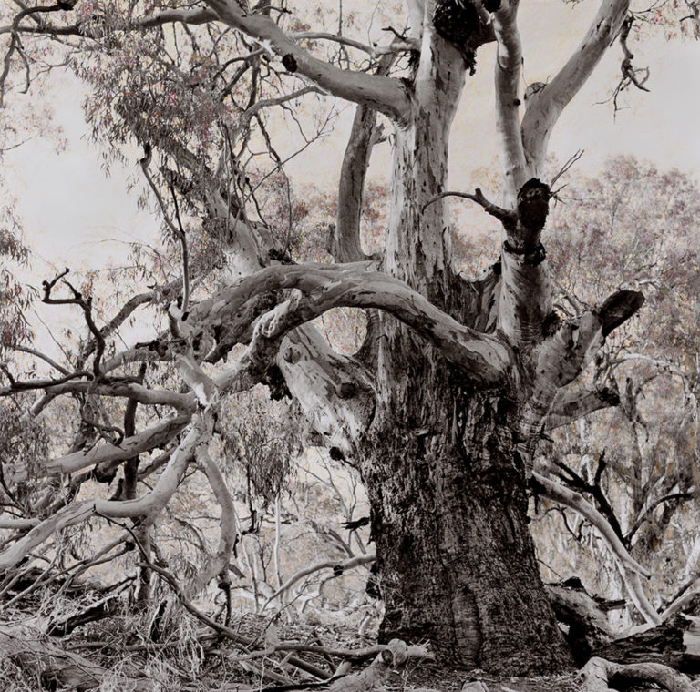 Cumpston handcolours large-scale landscapes of the Murray-Darling river system as a way of documenting traces of Indigenous occupation and to bring our attention to the decline of the area’s delicately balanced ecosystems. In Great Grandmother Barka, Cumpston illustrates the cultural significance of river red gums trees found on the Barka (Darling River) as a symbol of resilience and connection to Country. In making these works, Cumpston is drawing attention not only to the importance but also to the fragility of these natural wonders, which are in a state of declining health and remain under threat from environmental degradation. 1