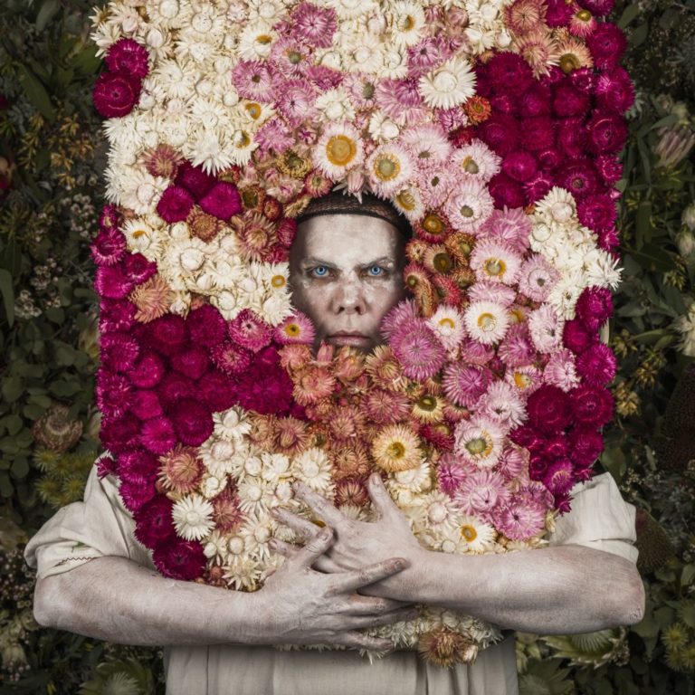 In his most recent series, Equinox (the equinox is when the sun shines equally on the earth’s northern and southern hemispheres), he plays a spirit figure that in each print is posed with Thompson’s signature baroque regalia. As if the burden of prophecy has left them resigned to the sad fate of humanity, these spirit figures are too lost in melancholic thought to notice us gallery spectators. This transcendental affect transforms the gallery into the pious space of the cathedral where we mortals seek atonement for our sins. One spirit ascends into the clouds, one is beatified in a halo of everlasting daisies that it wears like a large mask and another seemingly drowns in a sea of Australian natives. The other three prints are framed by proteas that blaze from the dark sky like Van Gogh’s stars, their hair tossed (I imagine) by the winds of an approaching storm. Cradled in their hands are the masks of three bearded besuited Victorian gentlemen, cut out from nineteenth-century prints.