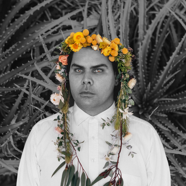 In his 2017 series Lake Dolly he employs Australian botanicals to arrange on his form as a vessel or armature. The artist draws on disparate themes, using materials that evoke spirituality; the figure is transmogrified into an equally enchanting and haunting form.