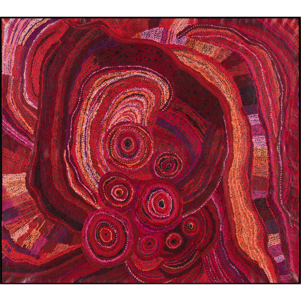This work exemplifies Petyarre’s unique visual language, developed over years of experimentation with layering, colour, and scale. While deeply grounded in traditional law, her practice also reflects a contemporary sensibility, bringing ancient narratives into the realm of global contemporary art.