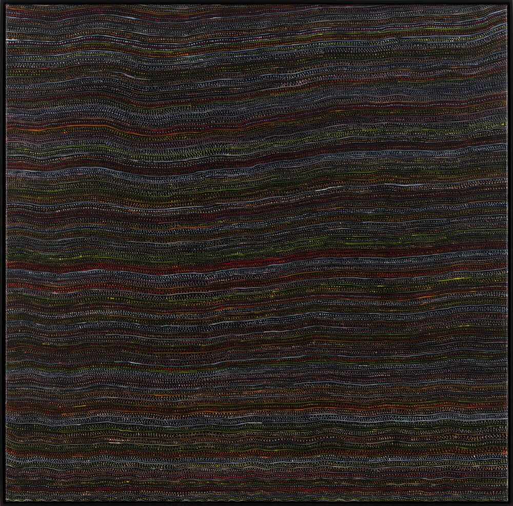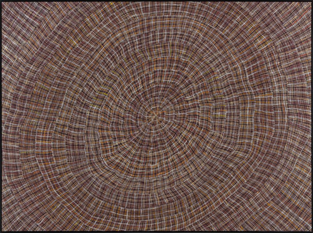 Regina Pilawuk Wilson (1948, Daly River Region, NT, Australia) is a Ngan’gikurrungurr woman, senior artist and Cultural Director of Durrmu Arts Aboriginal Corporation. In 1973, together with her husband, Harold Wilson, Regina founded the Peppimenarti (meaning ‘large rock’) Community as a permanent settlement for the Ngan’gikurrungurr people. The location of the community is an important dreaming site for the Ngan’gikurrungurr language group and is situated amid wetlands and floodplains at the centre of the Daly River Aboriginal Reserve, 300 kilometres southwest of Darwin. In 2003 Regina won the General Painting category of the Telstra National Indigenous and Torres-Strait Islander Award for a golden syaw (fish-net) painting. Examples of her work are held in the collections of the Art Gallery of New South Wales, The National Gallery of Victoria, The Gallery of Modern Art (Queensland Art Gallery), The British Museum and numerous private and corporate collections in Australia and overseas. Her paintings have been included in many group exhibitions at public and private art institutions, including the 3rd Moscow Biennale of Art, the Wynne Prize (2008 and 2009), AGNSW, and Dreaming Their Way: Australian Aboriginal Women Painters at the National Museum of the Arts, Washington. Her work was recently exhibited in Marking the Infinite, at the Phillips Collection in Washington DC (2018) and at Second Street Gallery, Charlottesville (2018).