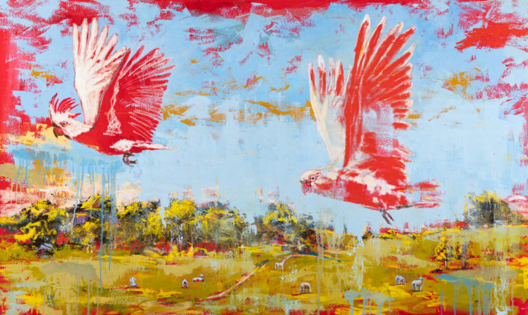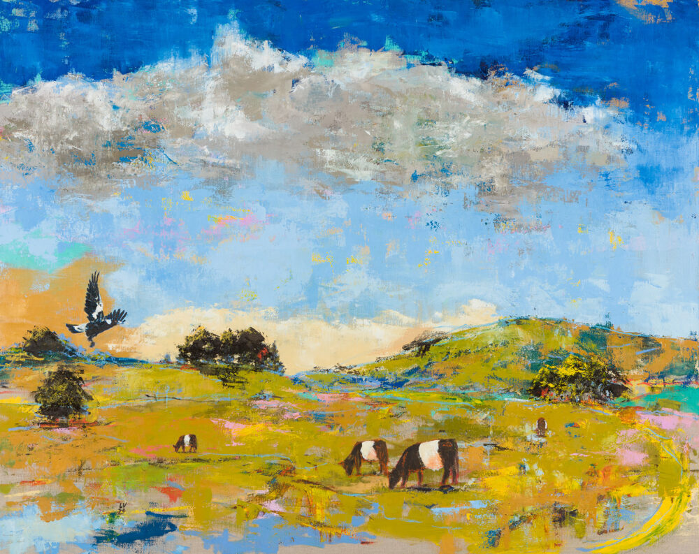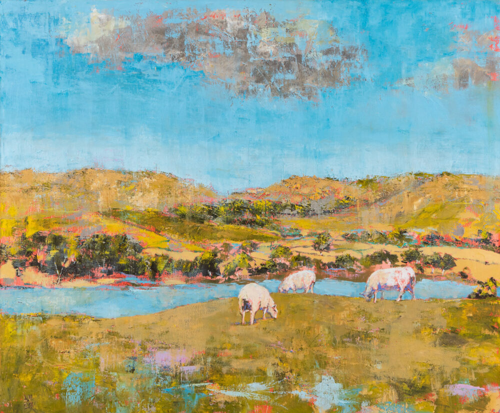 Unsurprisingly for someone whose family has farmed for generations, Lucy Vader conveys a landscape that has been both seen and felt. She applies paint in thick, sumptuous layers blurring the boundary between abstraction and representation. Stand close to one of Vader’s works and her brushstrokes draw you into a richly textured world of deep colours – green, yellow, red and blue. Move away from the canvas and wide, grassy paddocks emerge, frequently populated by sheep – golden and camouflaged against parched yellow land, or with bright white fleeces that contrast with rain-restored grass. Vader’s sheep graze, run off or just look inscrutable, contributing a light-heartedness for which she has become known.