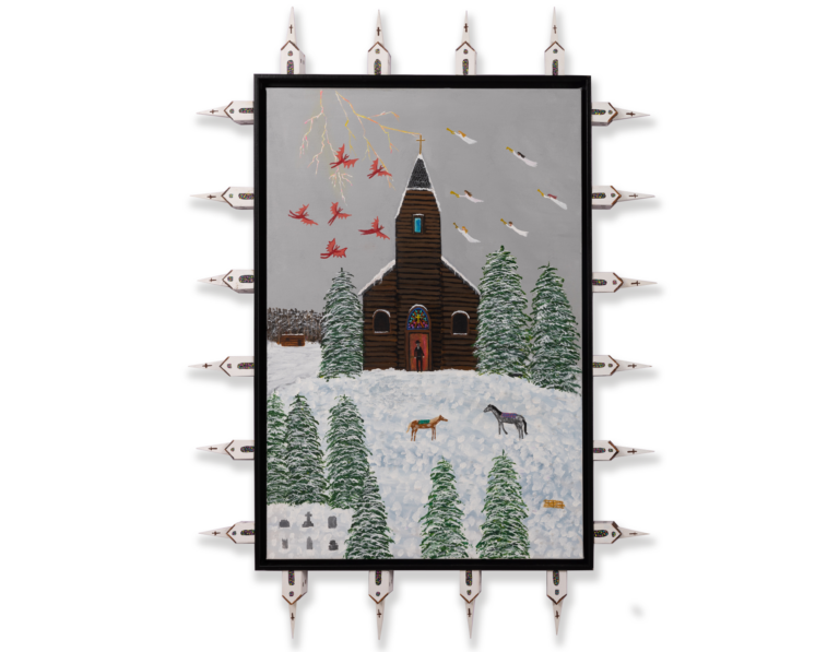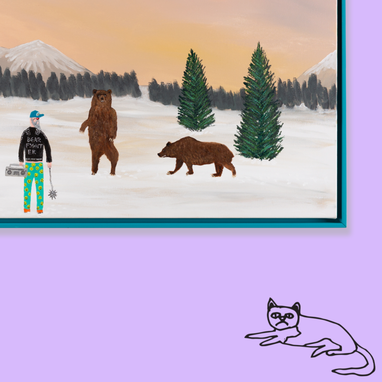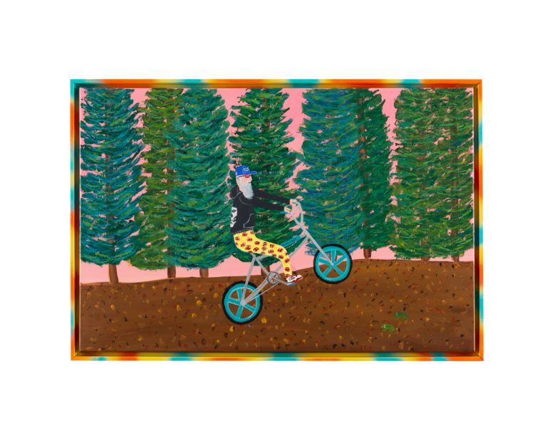 Marc Etherington’s works take pop culture, childhood memories and everyday domestic life as their subject matter, rendering them through a darkly humorous and sometimes absurd lens. References to Jurassic Park, Freddy Krueger, old-school video game aesthetics and boom-boxes point to experiences of coming of age in the 1980s and 1990s, while landscapes and interiors are depicted with an eye for amusing detail.