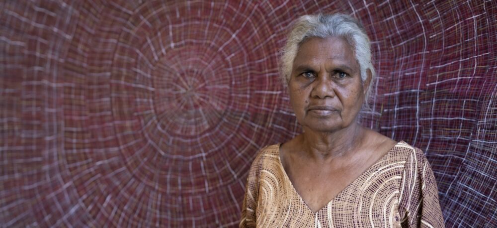 Regina Pilawuk Wilson (1948, Daly River Region, NT, Australia) is a Ngan’gikurrungurr woman, senior artist and Cultural Director of Durrmu Arts Aboriginal Corporation. In 1973, together with her husband, Harold Wilson, Regina founded the Peppimenarti (meaning ‘large rock’) Community as a permanent settlement for the Ngan’gikurrungurr people.