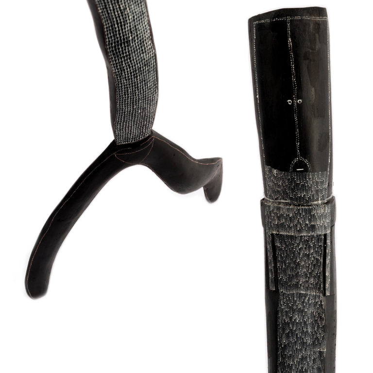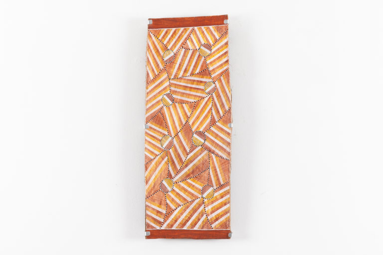 Ways of learning and schools of art in Arnhem Land are based around a system of passing knowledge and information on to others. The art here has its genesis in body design, rock art and cultural practices, in concert with more than 50 years of collaborations, travel and political action to retain ownership of country. Values and law are expressed through language, imagery, manikay (song), bunggul (dance), doloppo bim (bark painting), sculptures, and kun-madj (weaving) – the arts.
