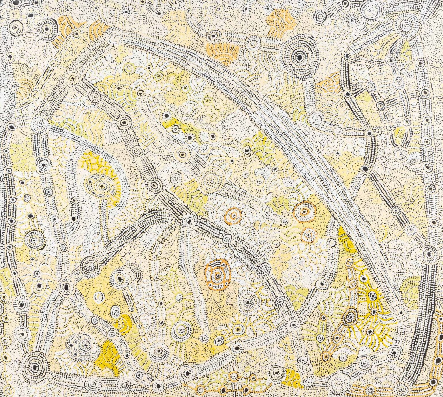Rendered in stark black and white, the ancestral moon-man appears, by turns, solemn, playful and elemental; his face endlessly compelling. “Japarra is white – the moon-man has a white body. All the stars are white and the moon is white too,” Tipungwuti explains of his palette, made from white ochre collected on Country at Wurankuwu. “I want to share my story and the story of my painting with people from all over the world.”