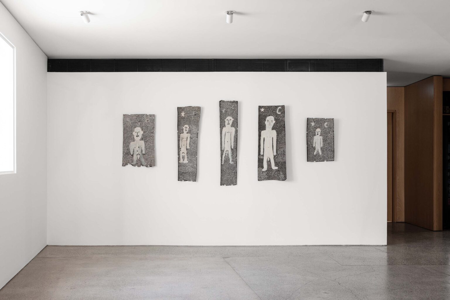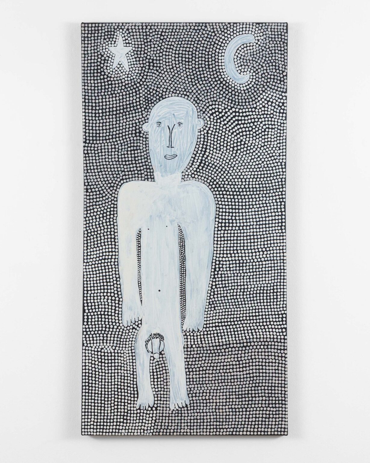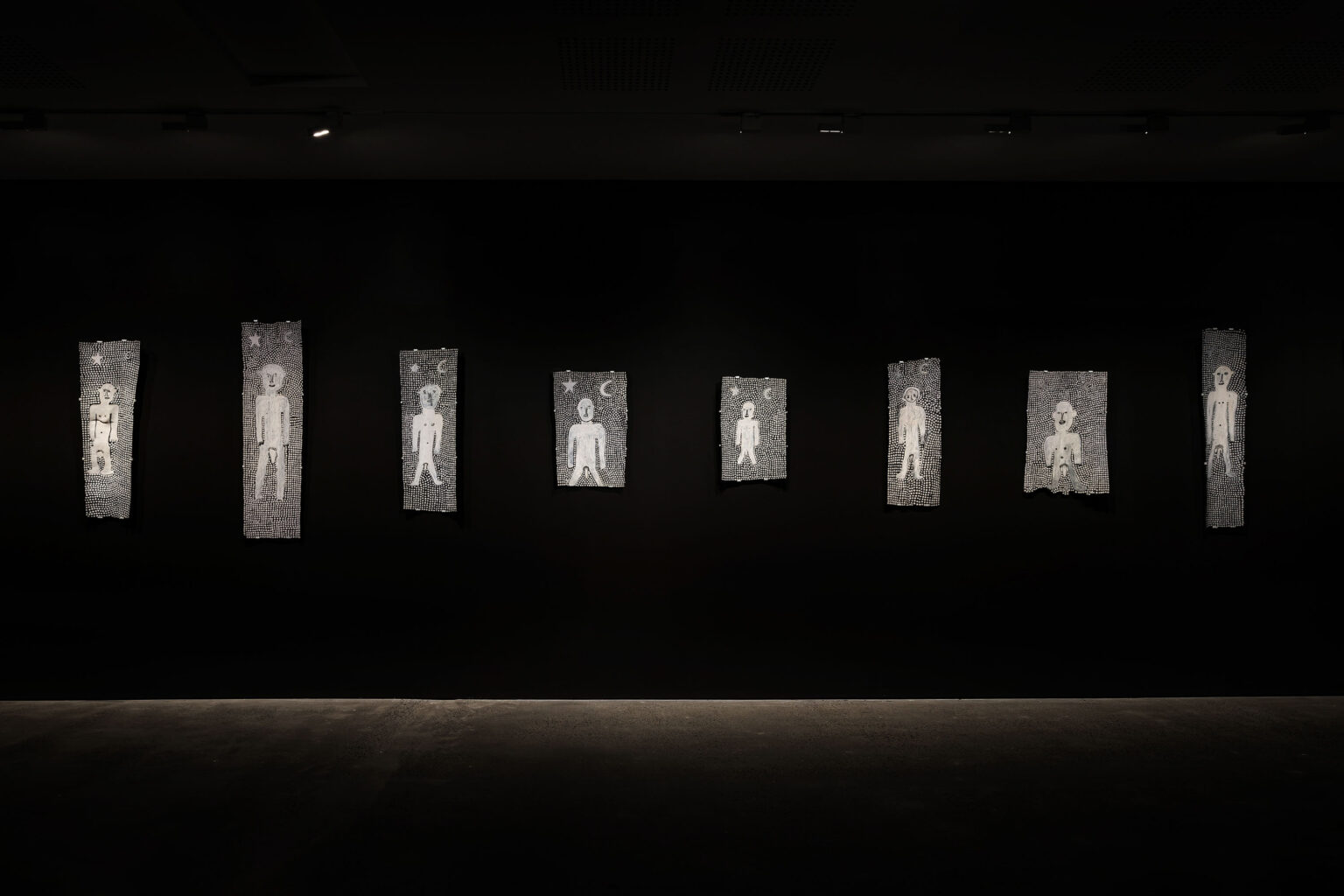 Across his striking monochrome works on bark and canvas, Tipungwuti depicts the celestial figures at the heart of Tiwi ceremonial culture: Japarra, the moon-man who brought mortality into the world, and japalinga, the stars whose ochred forms adorn dancers during ceremony and yoyi. “I paint Japarra because I want to tell that story from long ago – what he did on earth and keep that story going,” says the artist. The story recounts Japarra’s encounter with Purukuparli and Wai-ai, the death of their child, and his ascent to the sky, where his white light reminds the Tiwi people of the cycle of life and death.