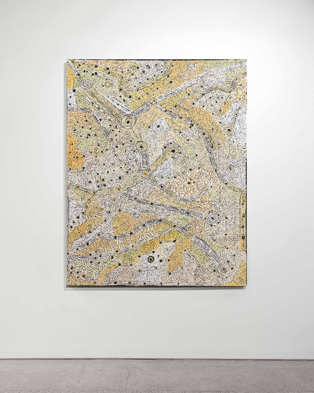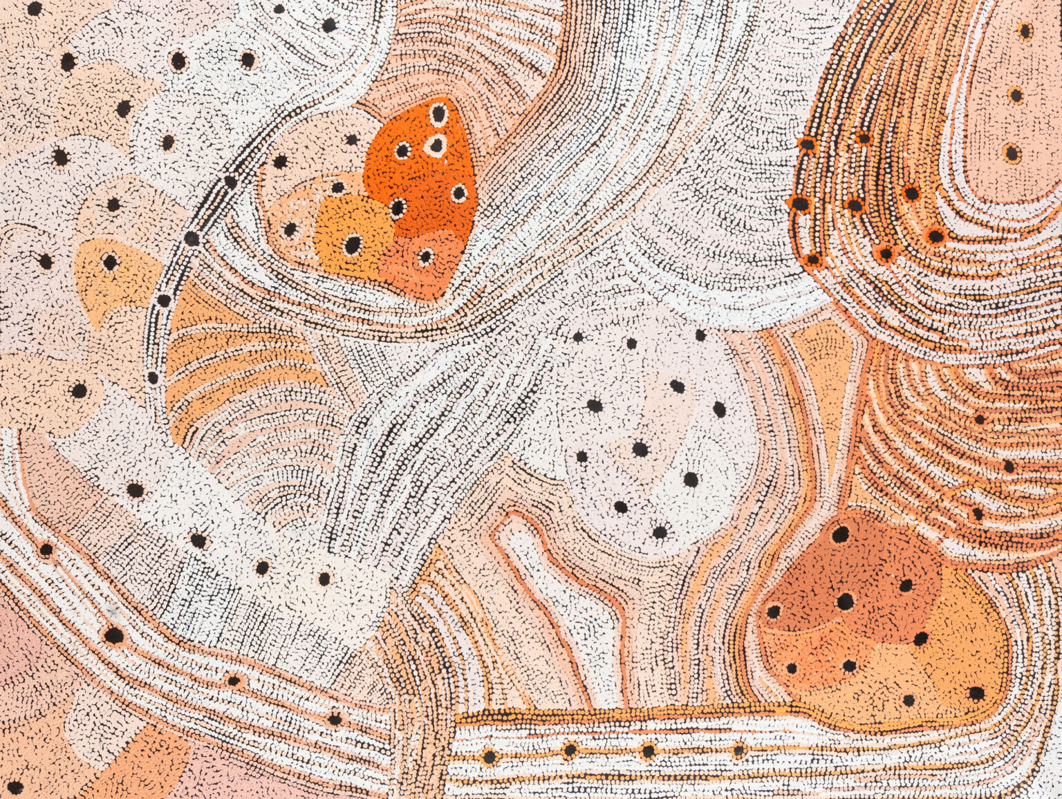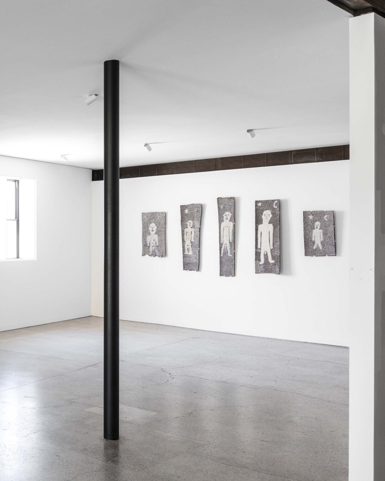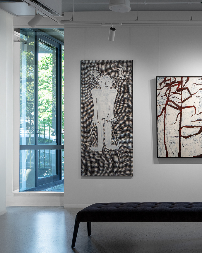 Across his striking monochrome works on bark and canvas, Tipungwuti depicts the celestial figures at the heart of Tiwi ceremonial culture: Japarra, the moon-man who brought mortality into the world, and japalinga, the stars whose ochred forms adorn dancers during ceremony and yoyi. “I paint Japarra because I want to tell that story from long ago – what he did on earth and keep that story going,” says the artist. The story recounts Japarra’s encounter with Purukuparli and Wai-ai, the death of their child, and his ascent to the sky, where his white light reminds the Tiwi people of the cycle of life and death.