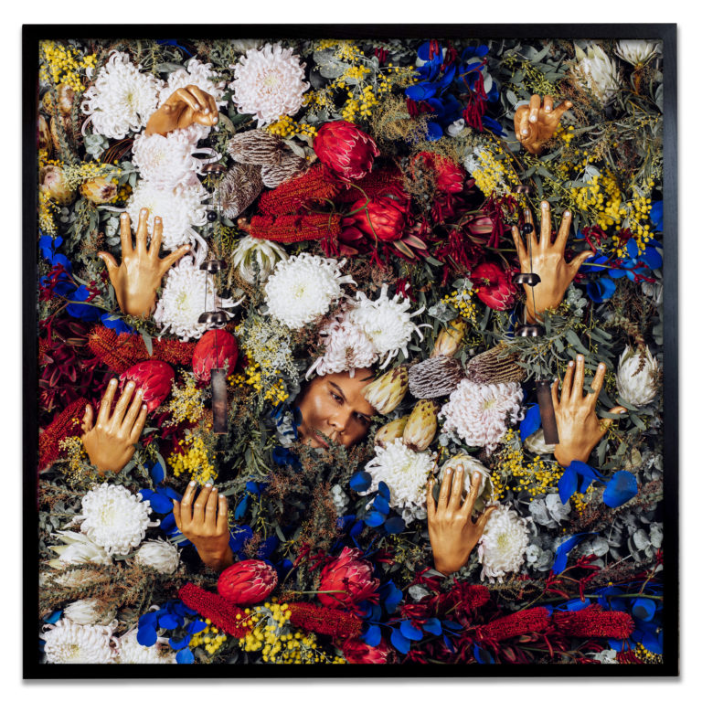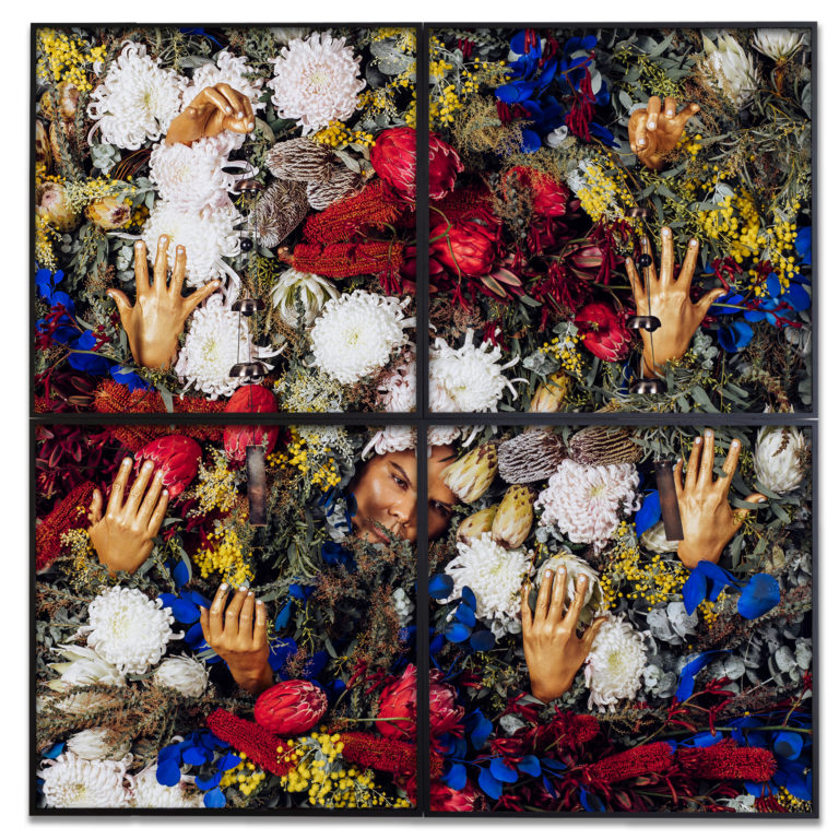 In April 2022 Dr Christian Thompson AO Exhibited his latest collection of artworks at Michael Reid Sydney. Encompassing performative photography and a new video work, the title of the exhibition took its name from Thompson’s new and unreleased photograph, Being Human Human Being. Boasting a softer palette of lavender and pastel yellow, Being Human Human Being joined a growing collection of Thompson’s arresting and enigmatic ‘Flower Wall’ works.