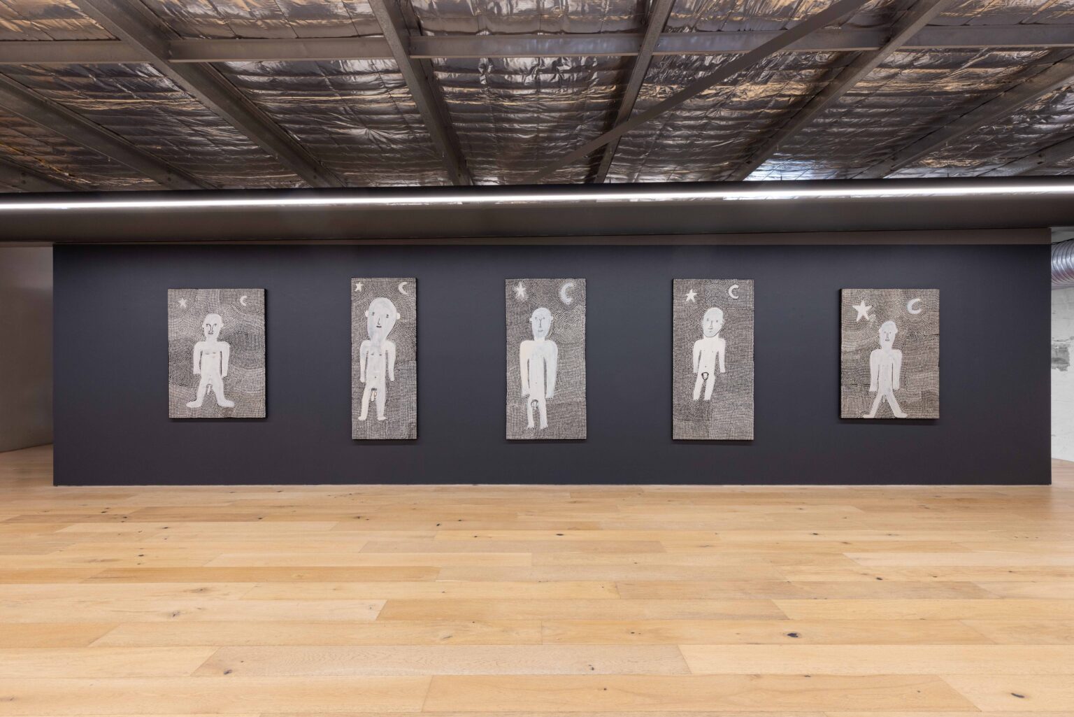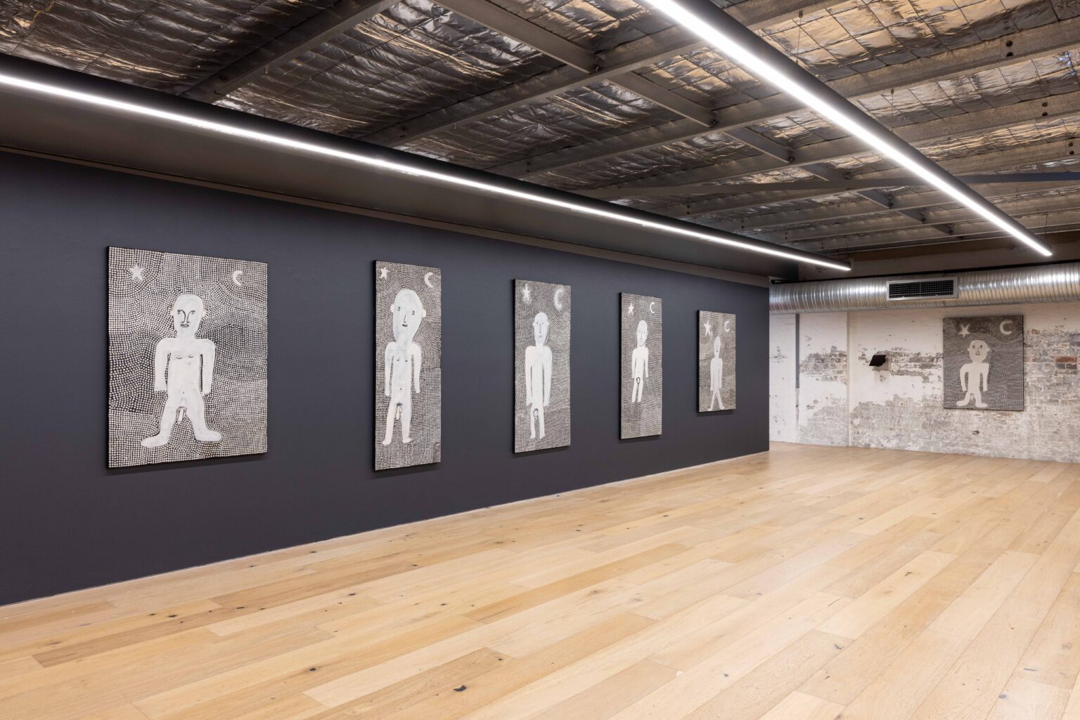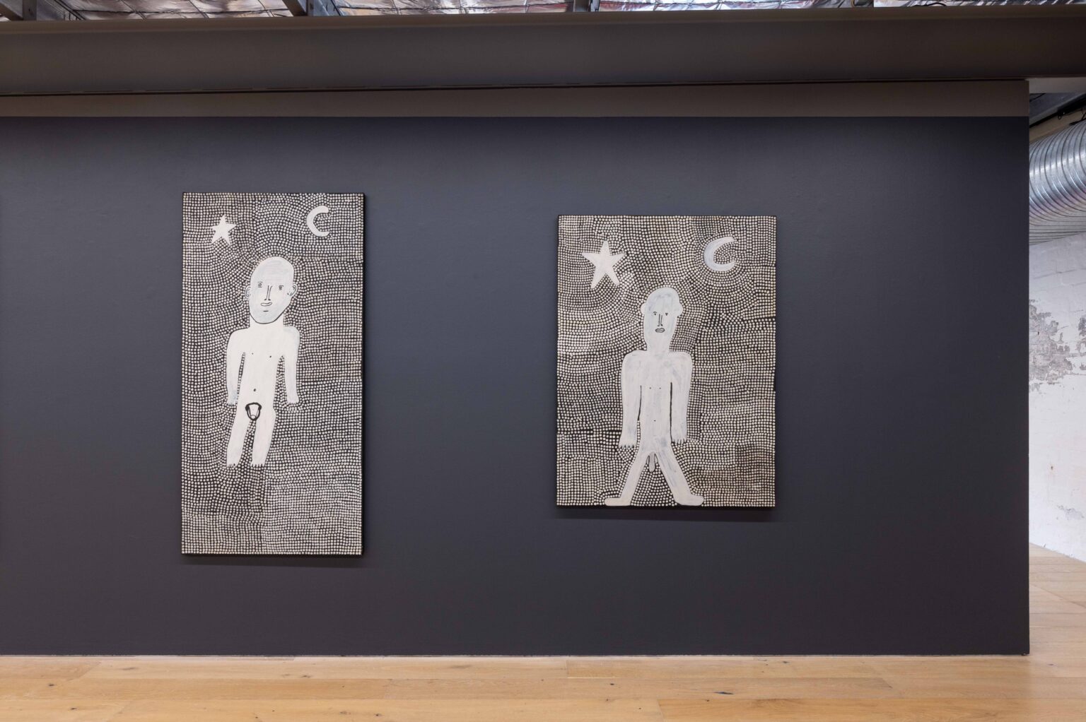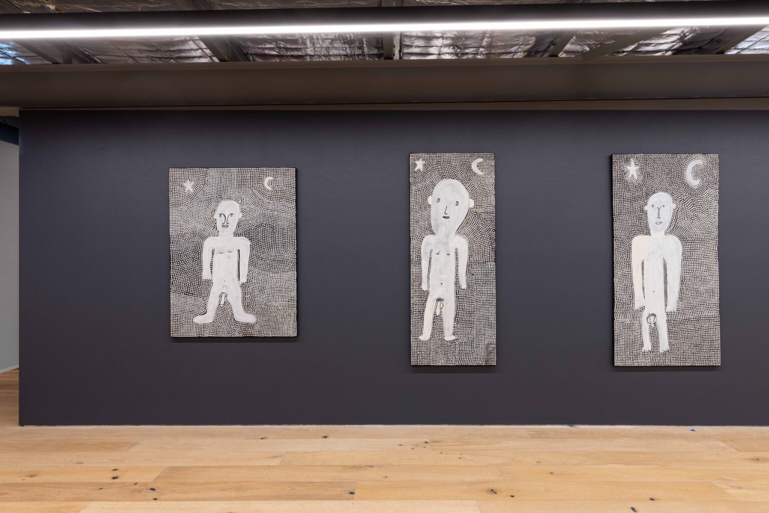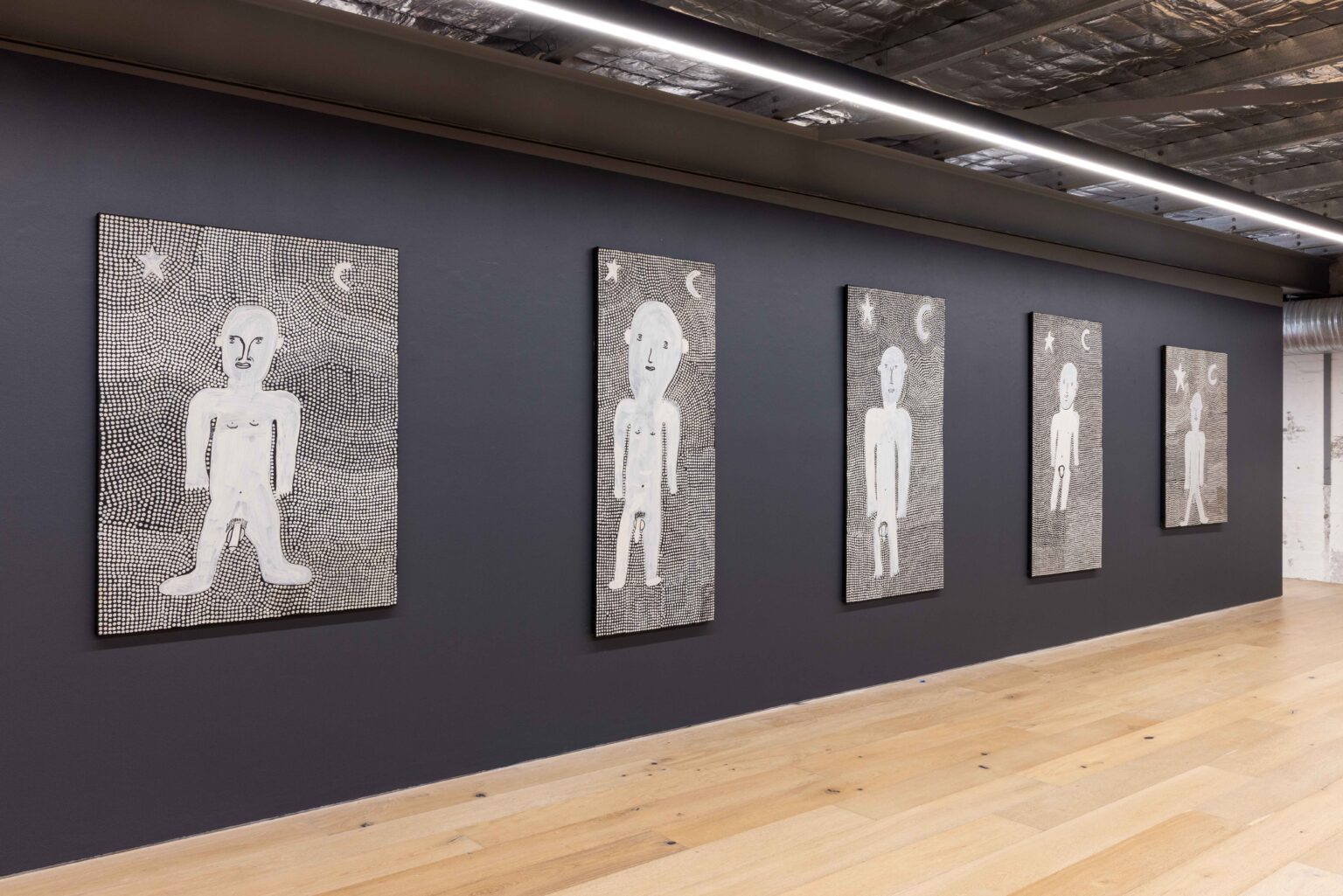 Across his striking monochrome works on bark and canvas, Tipungwuti depicts the celestial figures at the heart of Tiwi ceremonial culture: Japarra, the moon-man who brought mortality into the world, and japalinga, the stars whose ochred forms adorn dancers during ceremony and yoyi. “I paint Japarra because I want to tell that story from long ago – what he did on earth and keep that story going,” says the artist. The story recounts Japarra’s encounter with Purukuparli and Wai-ai, the death of their child, and his ascent to the sky, where his white light reminds the Tiwi people of the cycle of life and death.