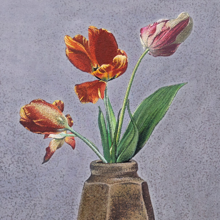 This much-awaited new show sees the reintroduction of orchids (craning upwards like triumphant marble figures) and poppies – gathered in careful equipoise – as signature subjects. We also find new directions from the artist, namely a beguiling depiction of a butterfly nestled among foliage at night and a charming portrait of his beloved cat.