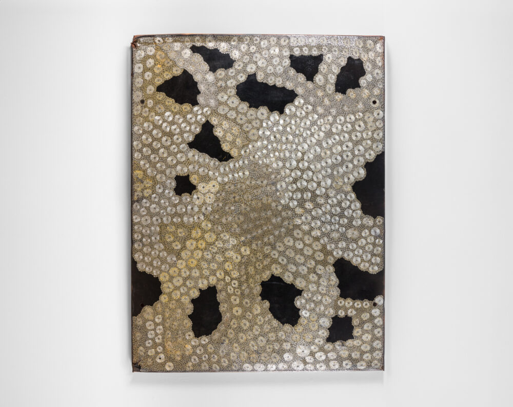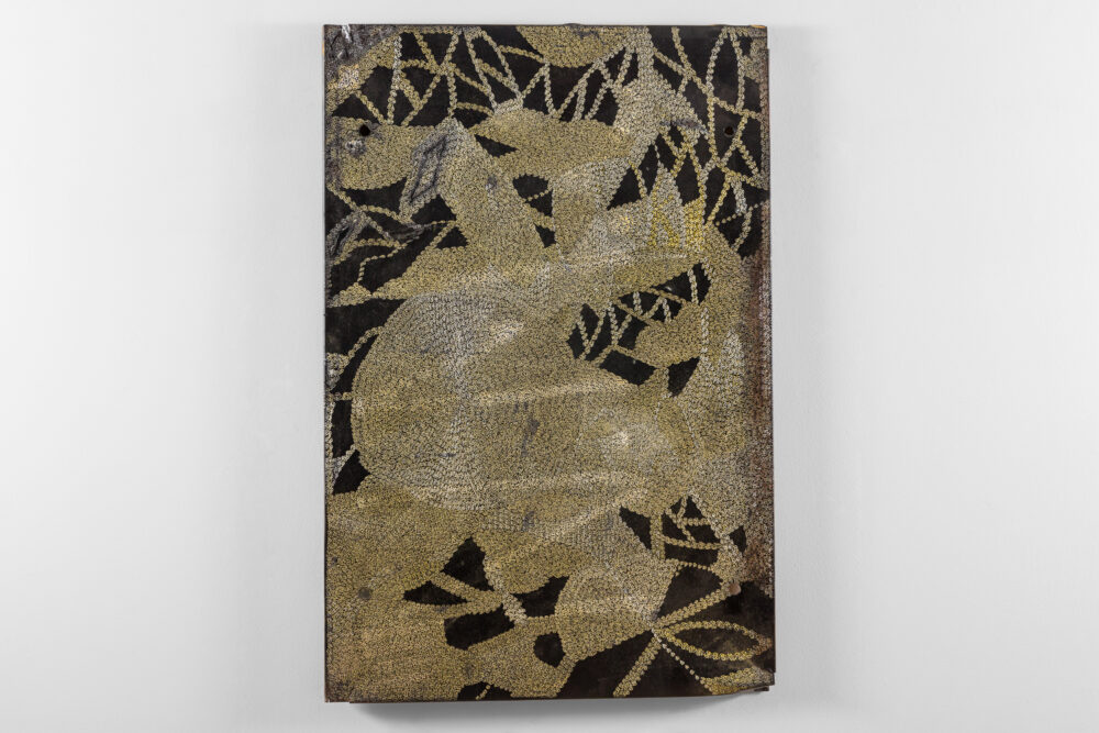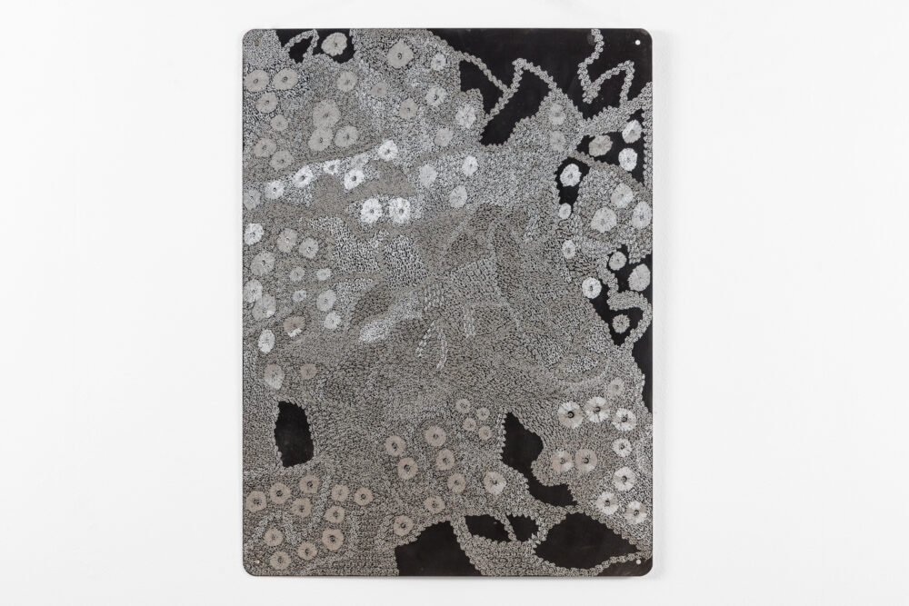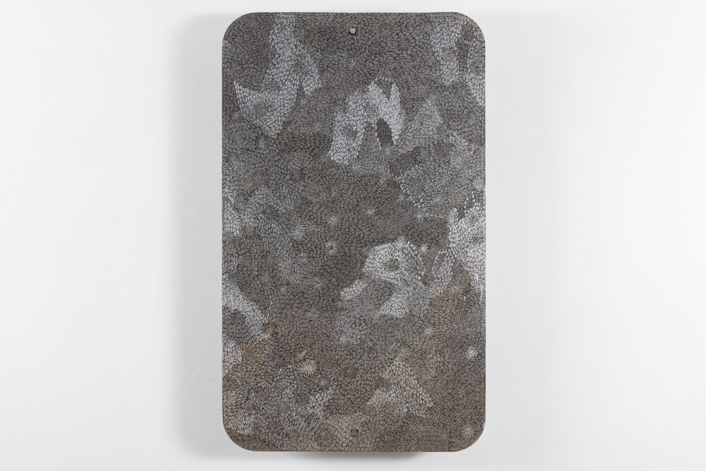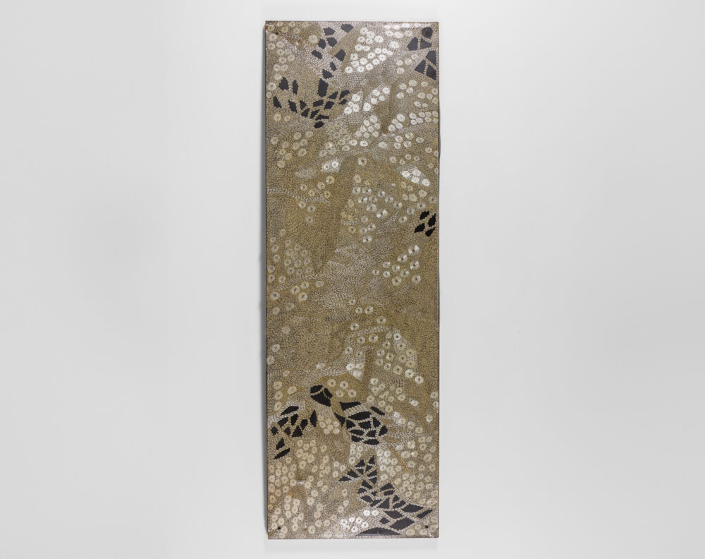 Through her practice, Wanambi honours the songlines of the honey-hunting Wuyal, an important ancestral being of the Marrakulu clan. Tiny Dawurr (honey bees) repeat across her work’s cut-metal surface, producing intricately detailed, shimmering effects with rhythmic undulations.