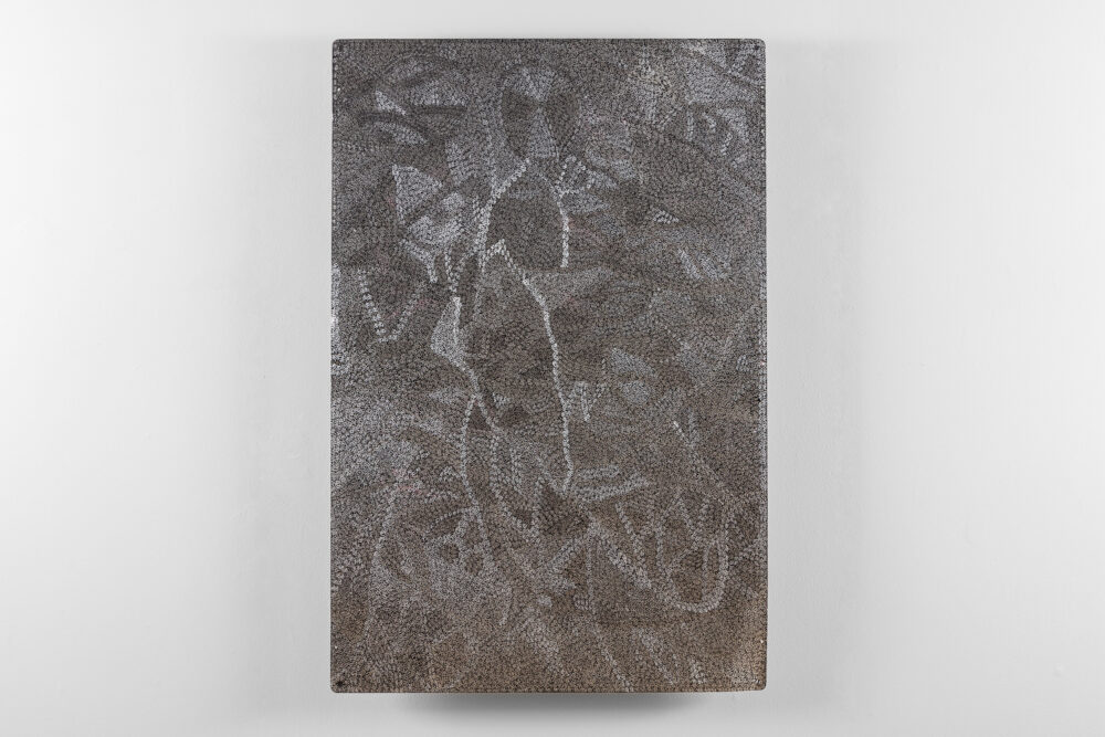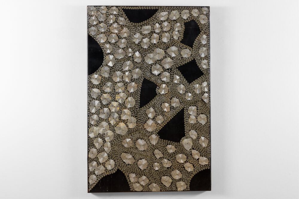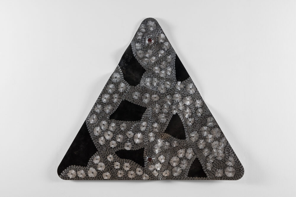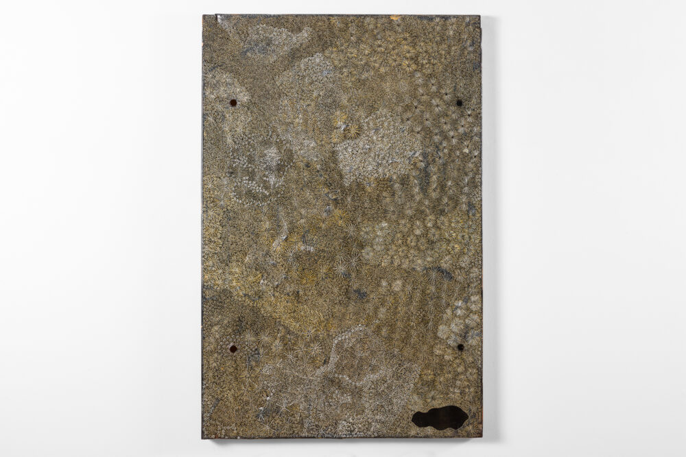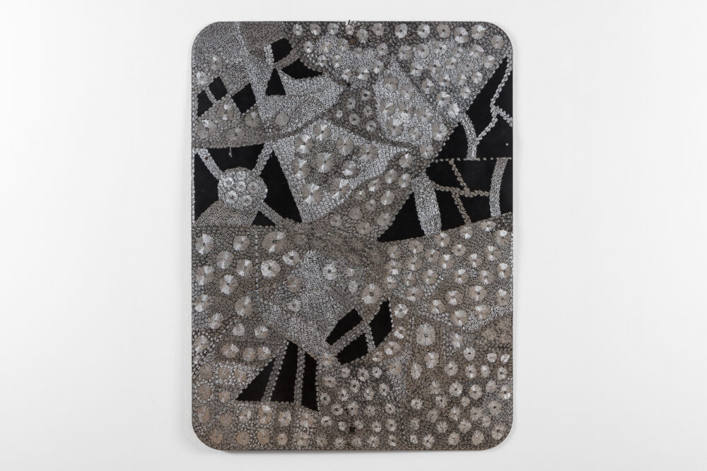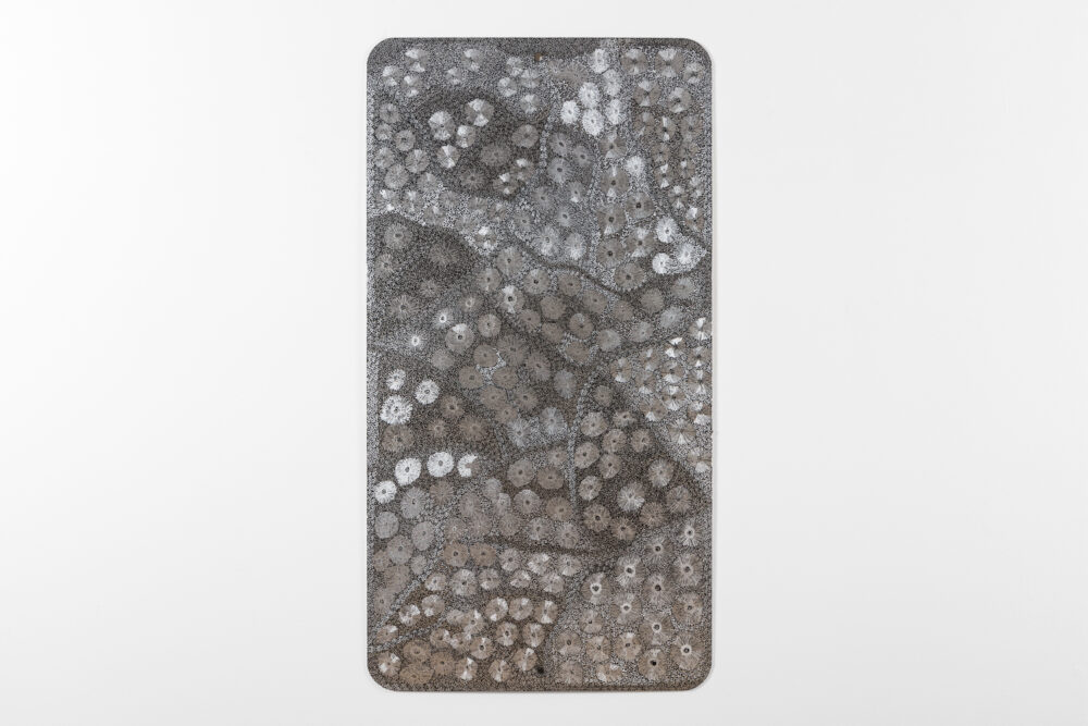 Through her practice, Wanambi honours the songlines of the honey-hunting Wuyal, an important ancestral being of the Marrakulu clan. Tiny Dawurr (honey bees) repeat across her work’s cut-metal surface, producing intricately detailed, shimmering effects with rhythmic undulations.