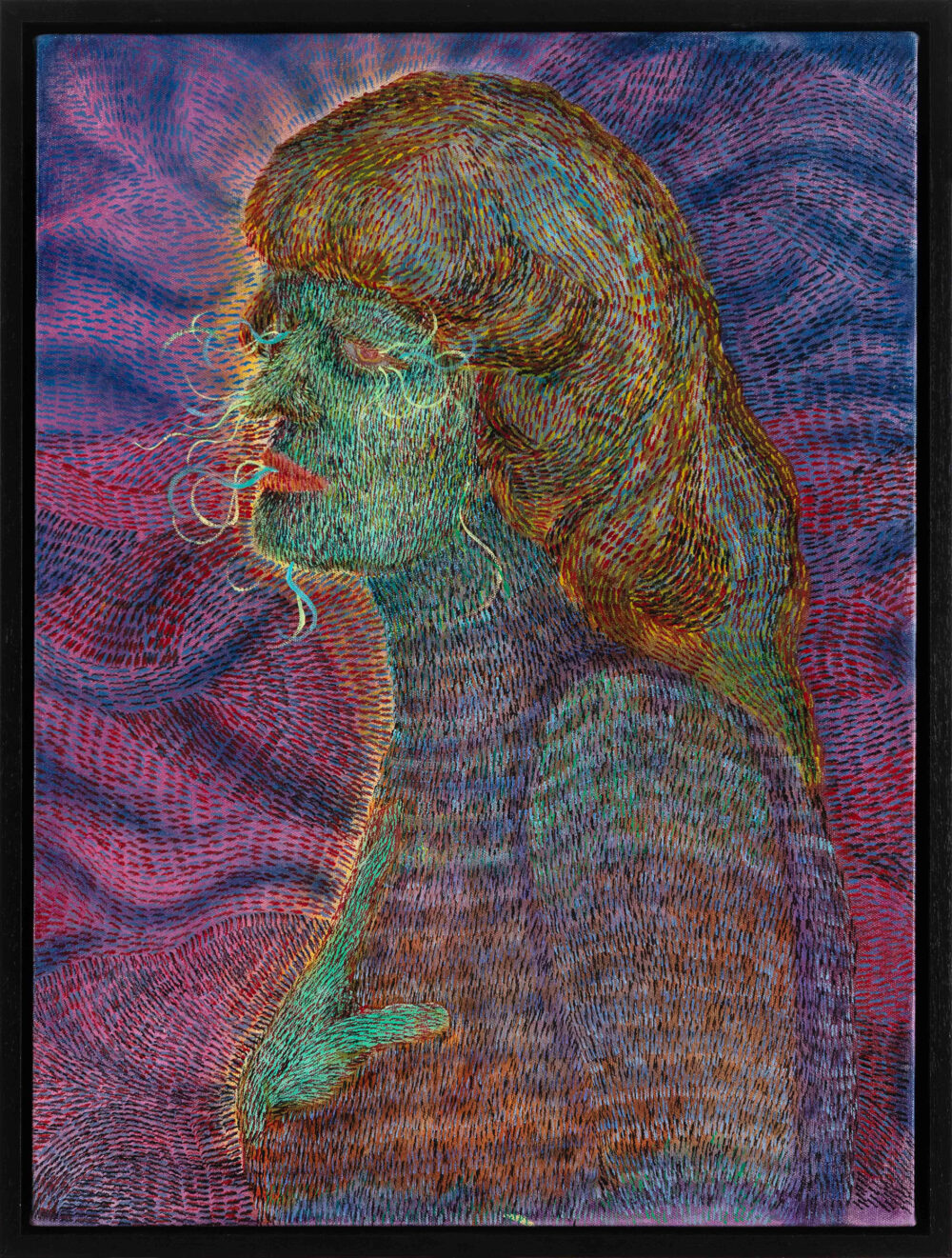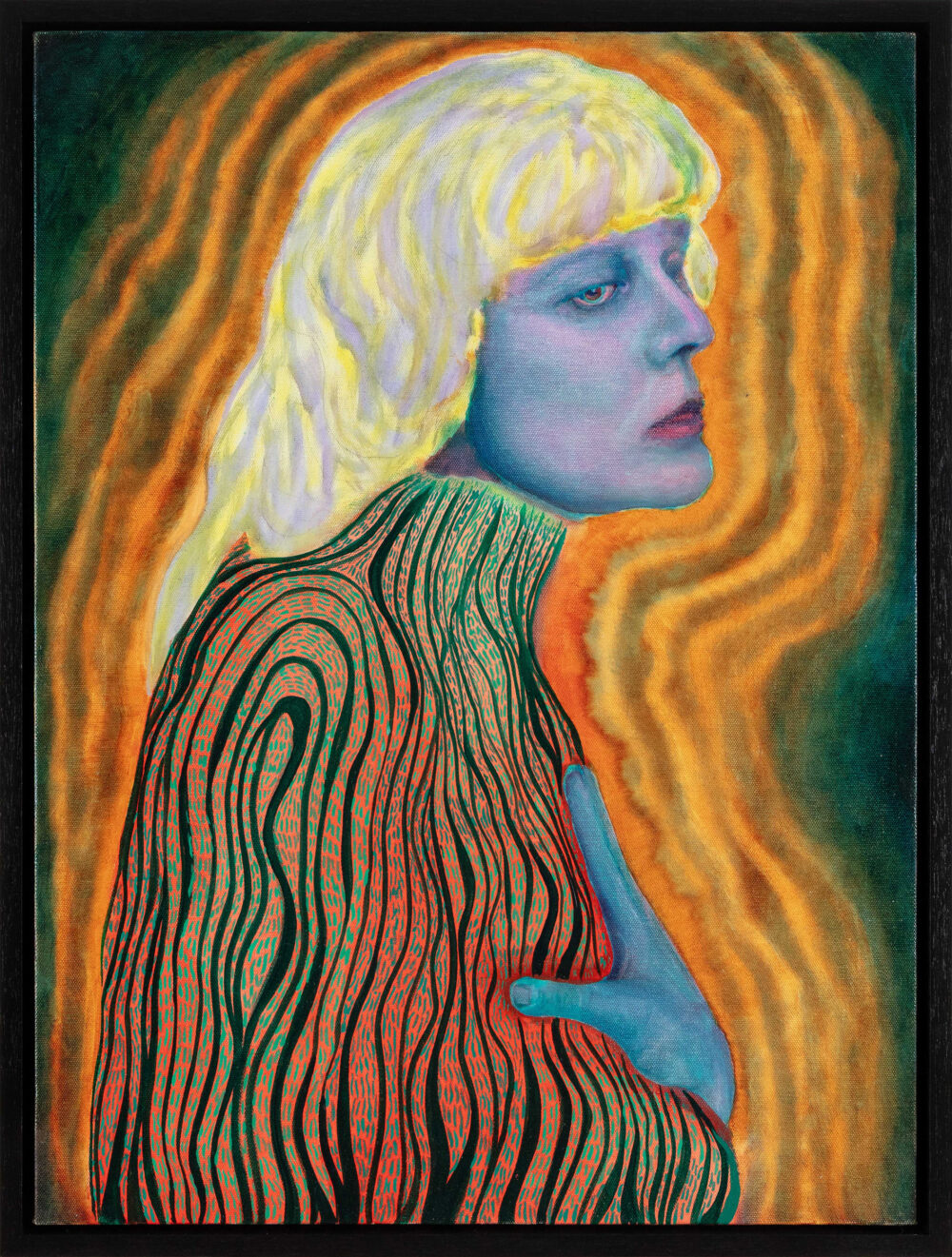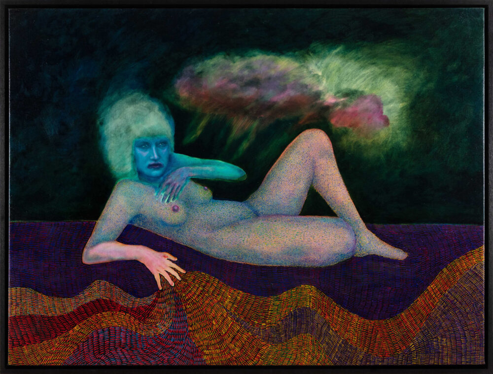 Gearin’s work invites the viewer to move beyond the material world into a lucid, otherworldly dimension. Her distinctive visual language draws from a deeply personal lexicon of references: from Shunga and Sanskrit Kama Sutra miniatures to 19th-century Symbolism. These influences converge with autobiography – fragments of memory, desire and transformation – resulting in paintings that are both intimate and elemental, charged with a kind of noirish eroticism, shapeshifting magic and mythic ambiguity.