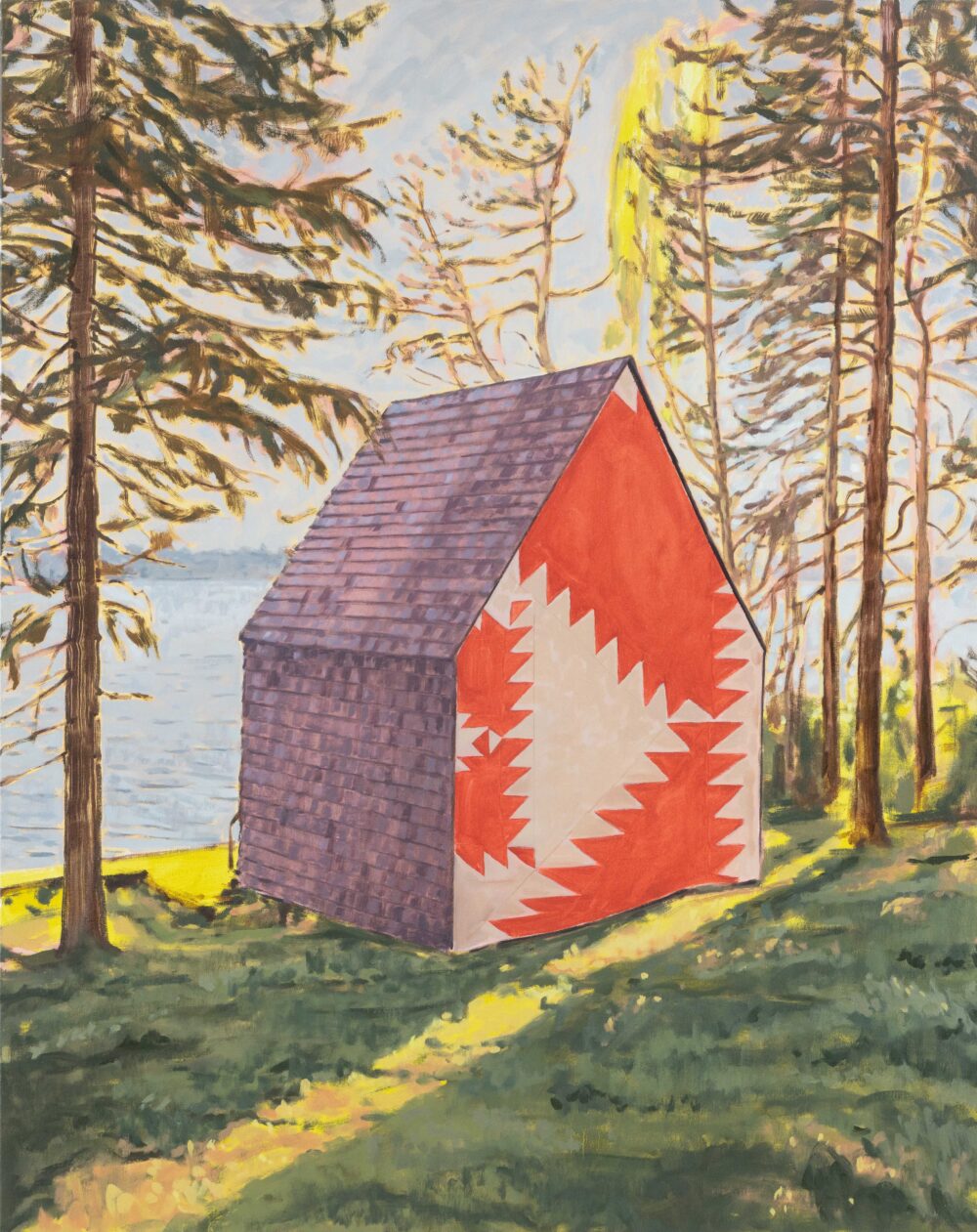 Despite the work’s compelling ambiguities, themes slowly coalesce through Chew’s Painting Now series, in which house-like structures repeat in various guises and take on poetic resonance. Whether temporary and improvisational – tents and makeshift A-frames – or suggesting past visions of a future utopia – modernist dream houses and geodesic domes – her recurring pitched forms invoke a universal language of shelter, inviting reflections on our longing for refuge and a place to call home.