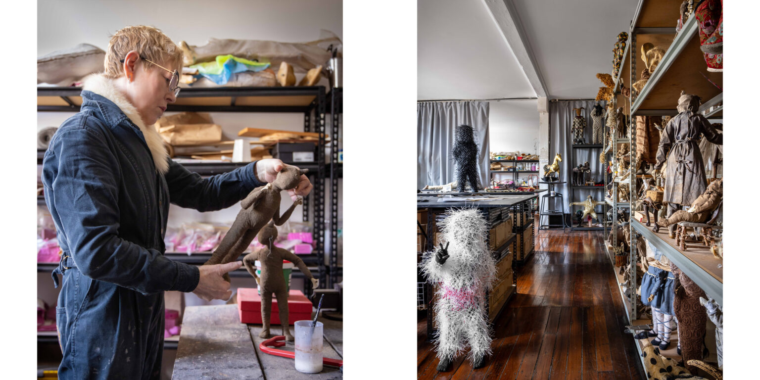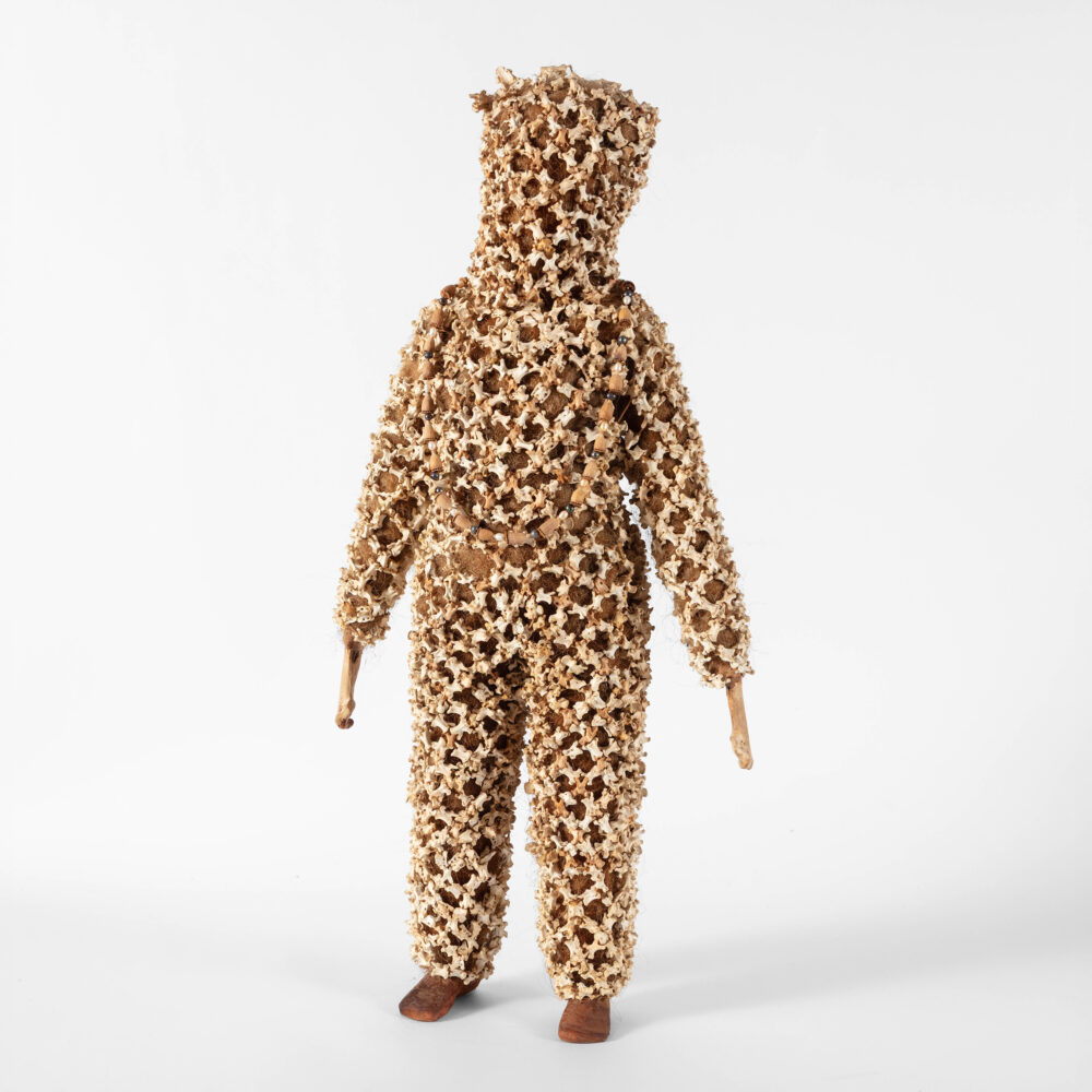 Perched on a stool at a workbench surrounded by an archive of totems and keepsakes, Linde Ivimey sits with her head bowed in concentration. Nearby, an audiobook plays; the text, a book on the mythology of ancient Mesopotamia. Her fingers move rhythmically as she pulls twine through a collection of tiny star-shaped bones, weaving them into a delicate lattice that will soon drape across a toddler-sized form waiting nearby.