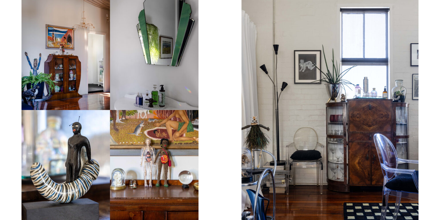 During the day, sun beams through long sash windows, illuminating piles of heavily-thumbed books and curious collections such as antique pocket watches, rosary beads, and a cabinet of uranium glassware.