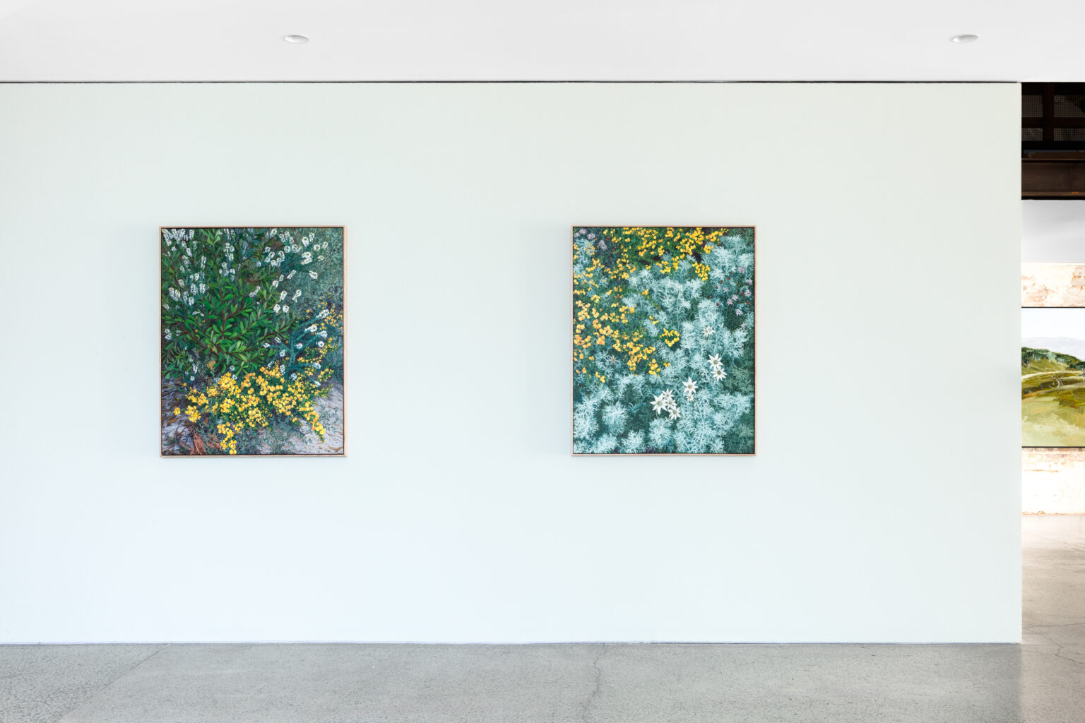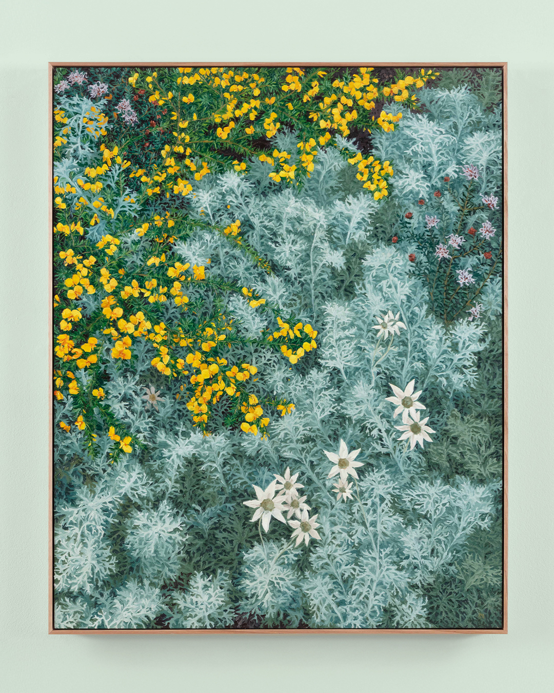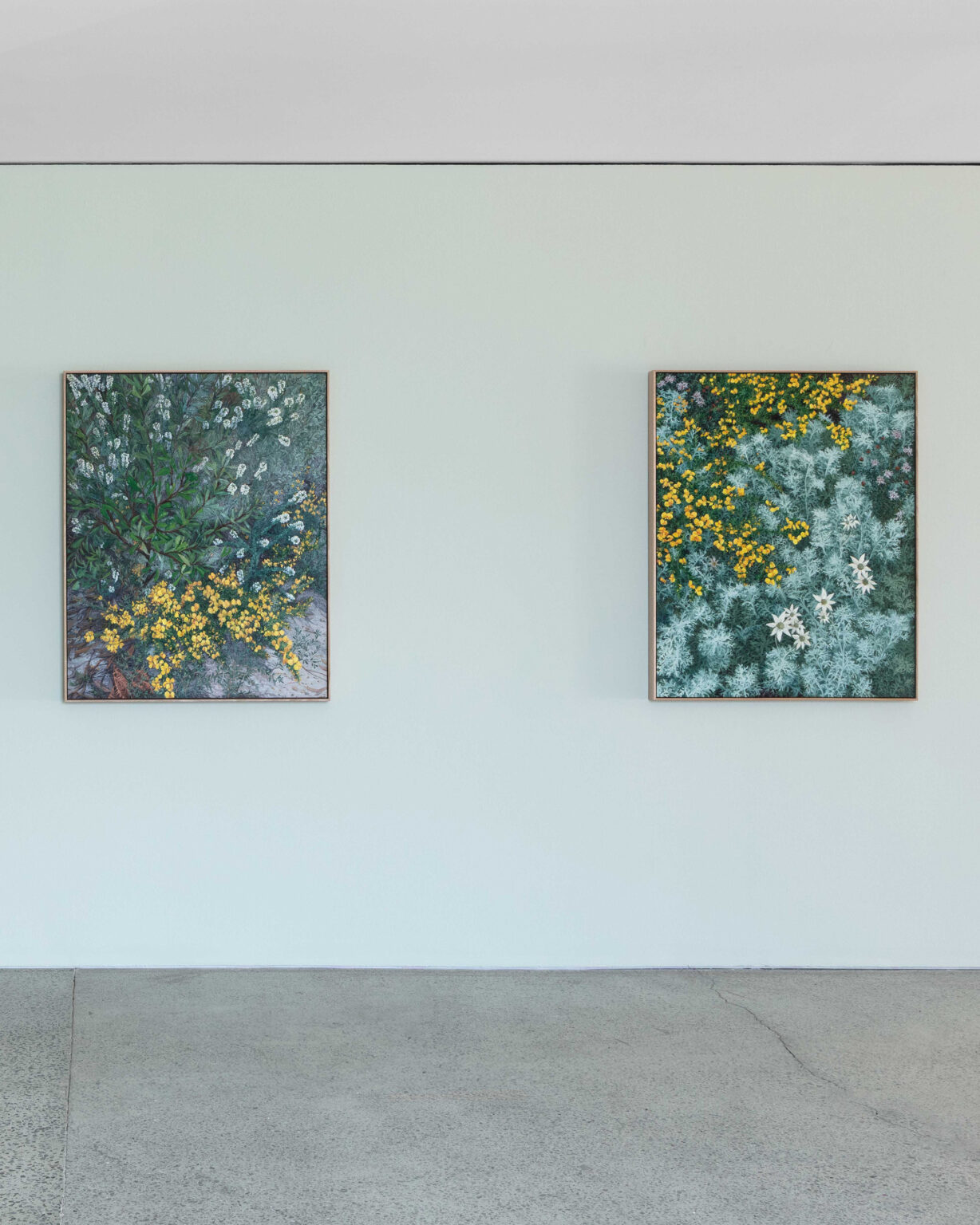 Moving with painterly gusto between areas of intricate, tightly controlled detail and an overall mood of untamed, impressionistic abundance, the artist’s dazzling profusions of native wildflowers teem and tangle right to the edge of each canvas.