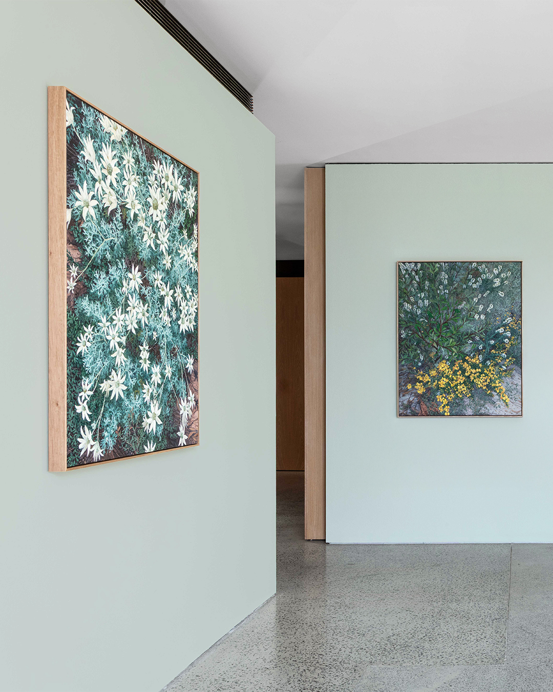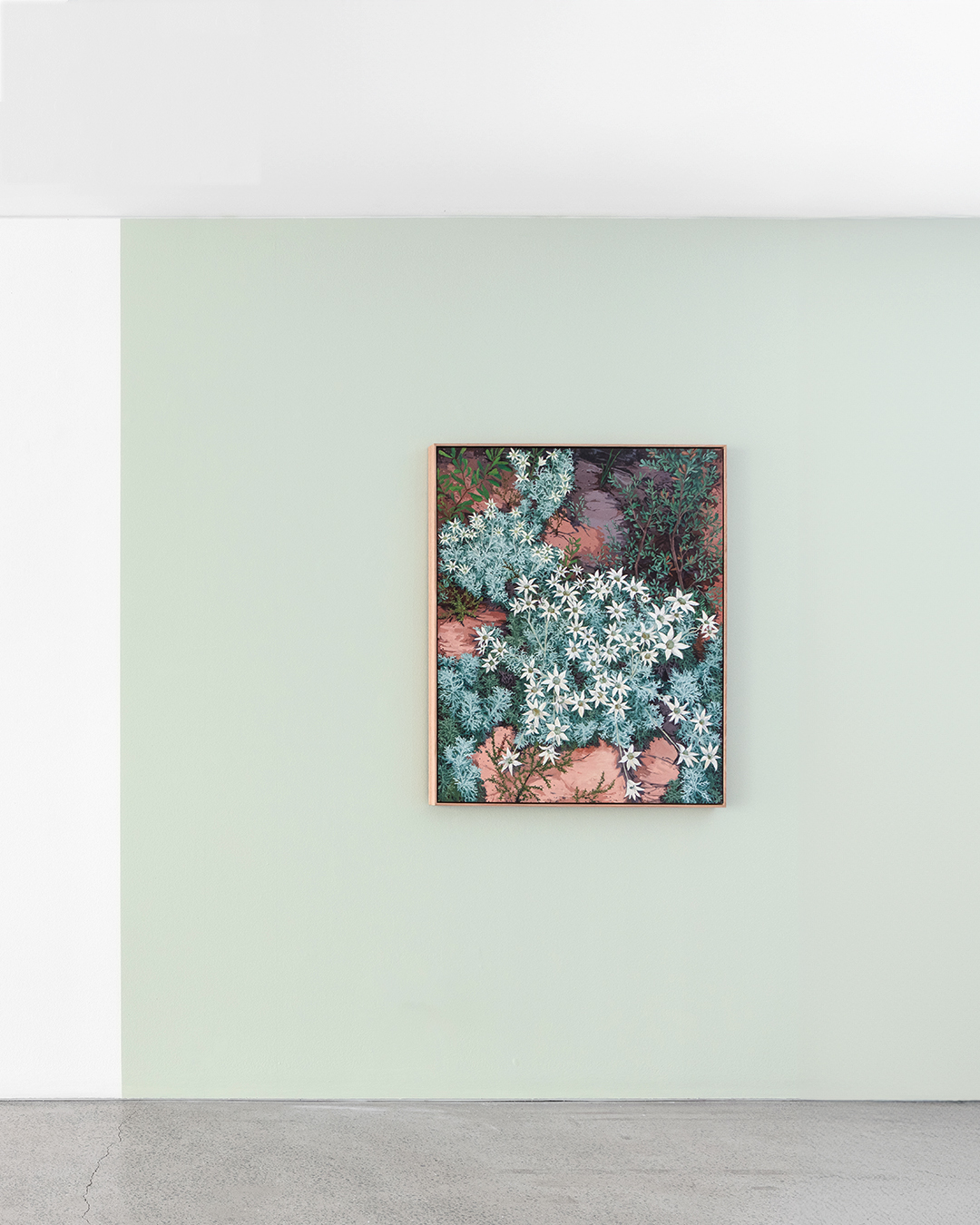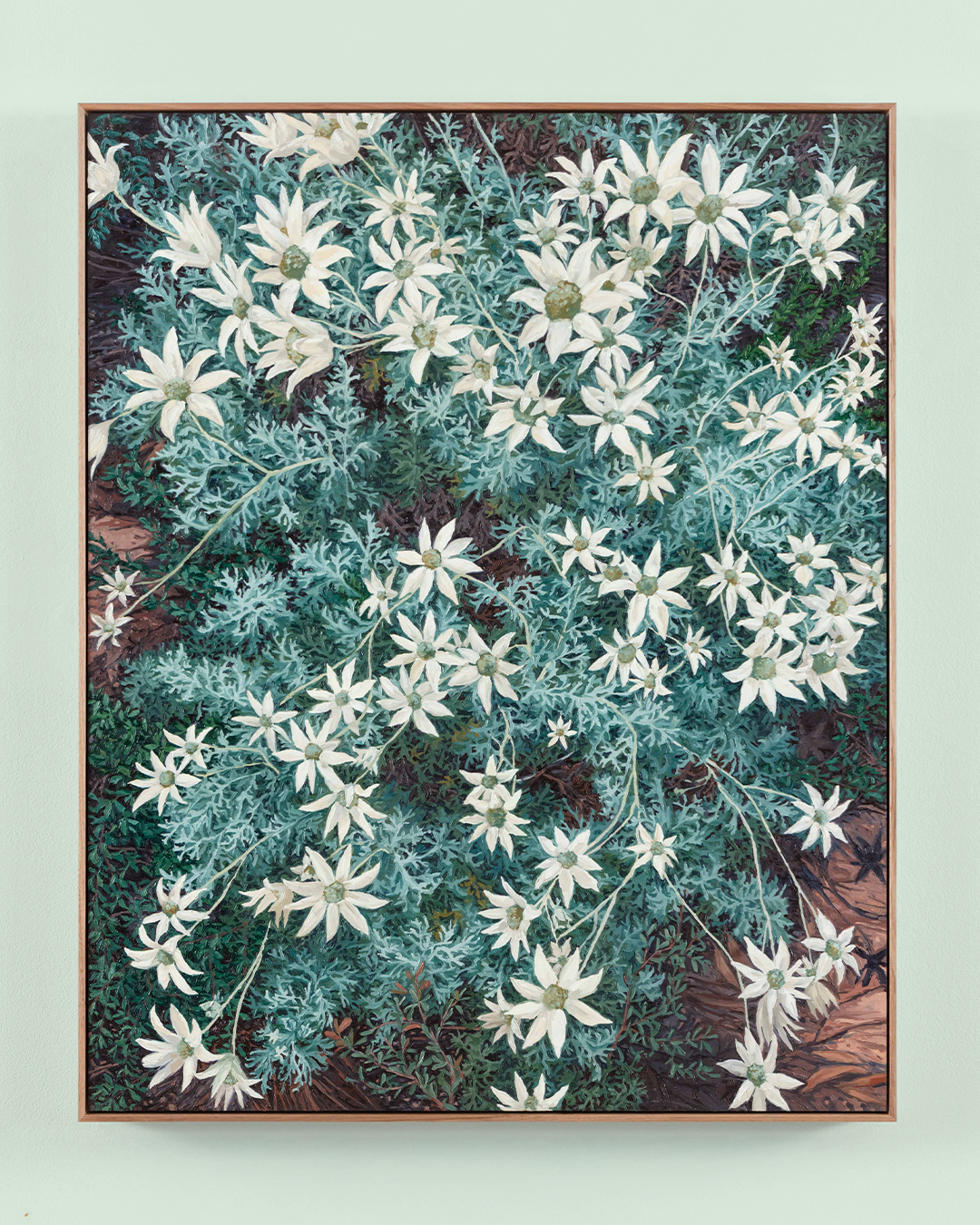 Moving with painterly gusto between areas of intricate, tightly controlled detail and an overall mood of untamed, impressionistic abundance, the artist’s dazzling profusions of native wildflowers teem and tangle right to the edge of each canvas.