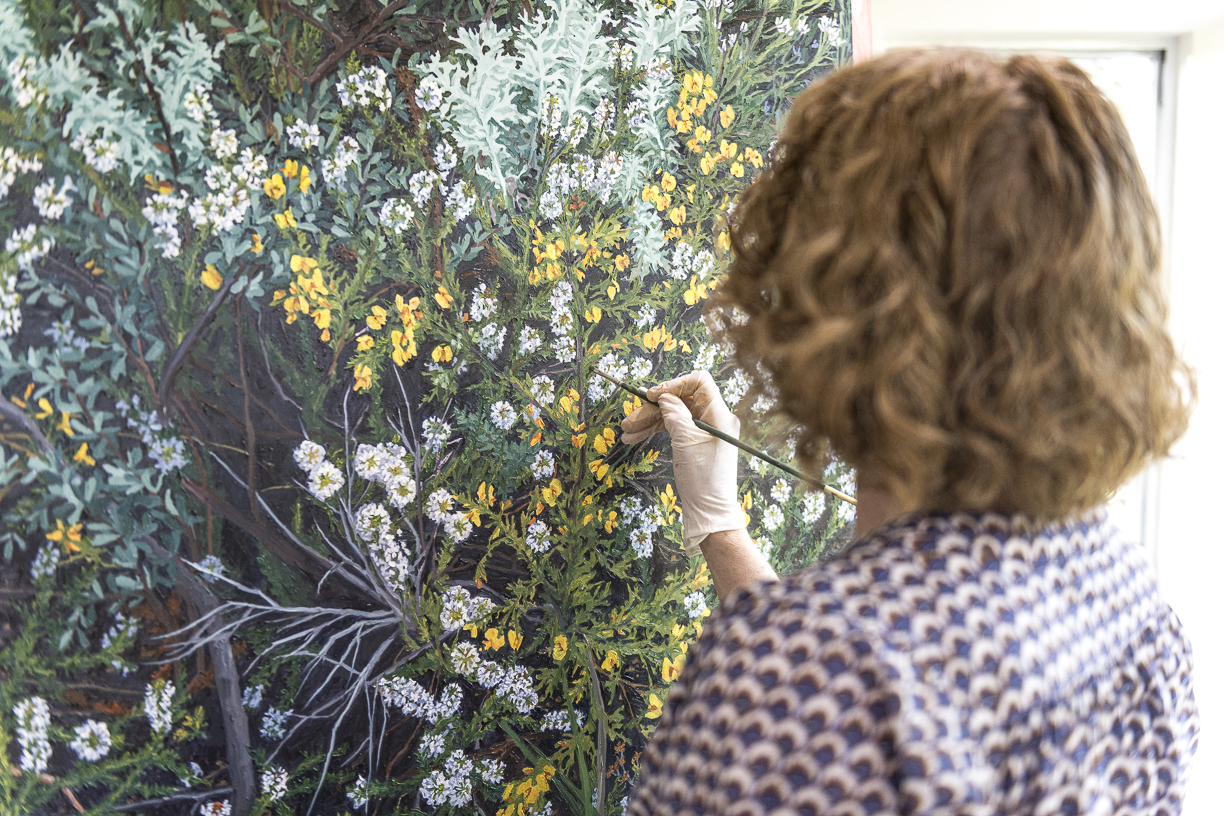 Building on the creative breakthrough of her widely celebrated Murrurundi shows Understory and Tendrils and Tapestries – as well as her recent collaboration with fashion brand Nancybird, which saw her elegant flannel flowers and other painted botanicals transposed onto textiles – Frith’s new works take us deeper into the thickets of the bushland covering Sydney’s North Head.