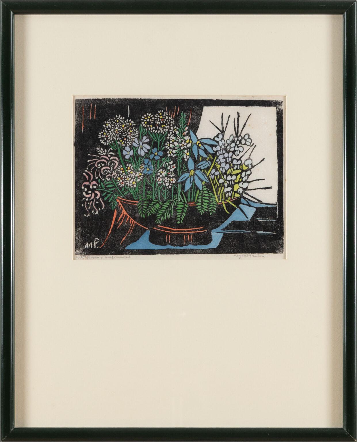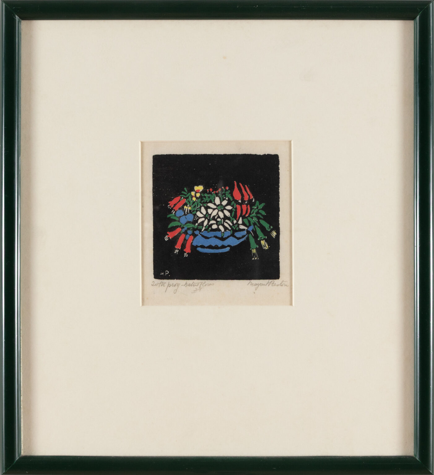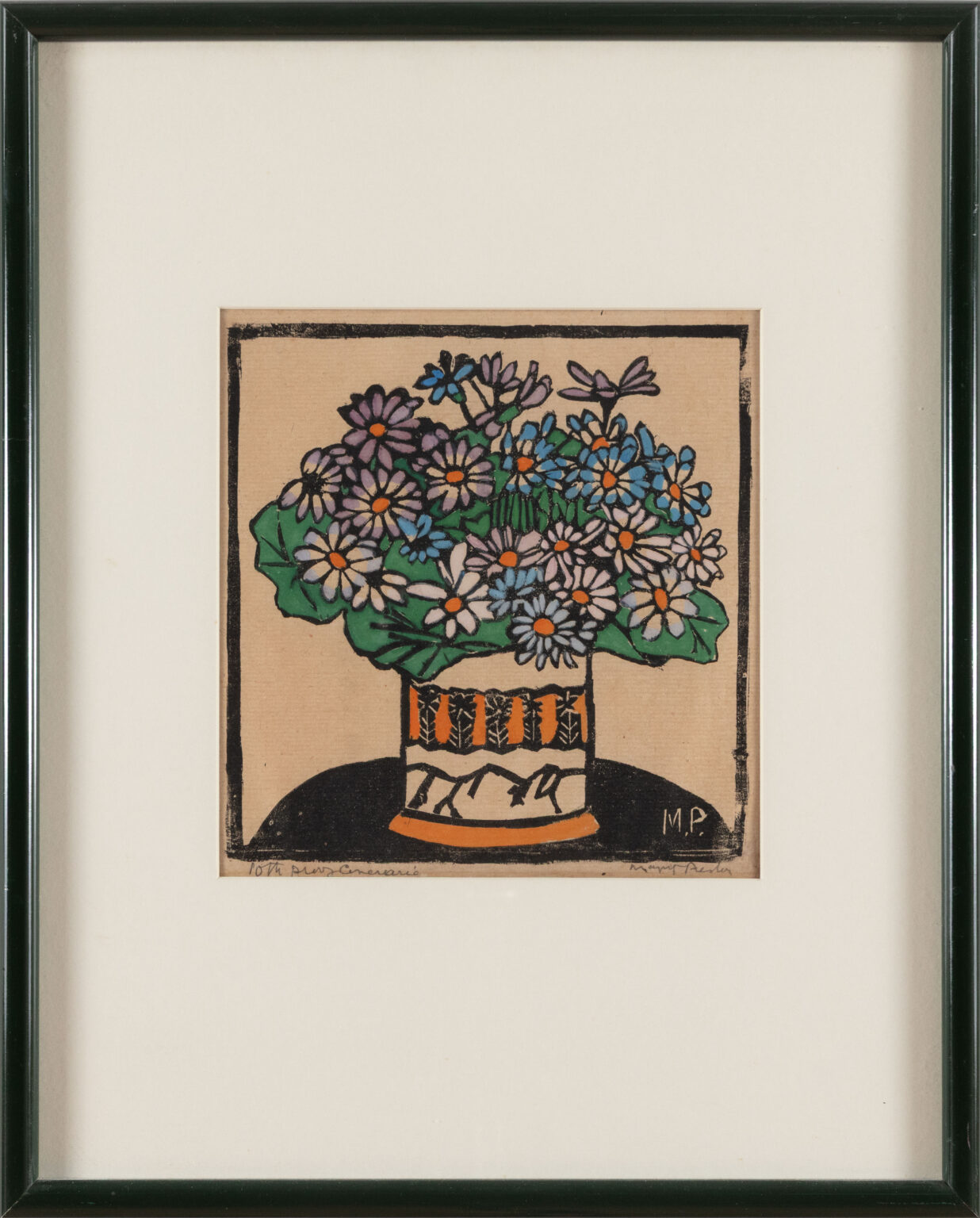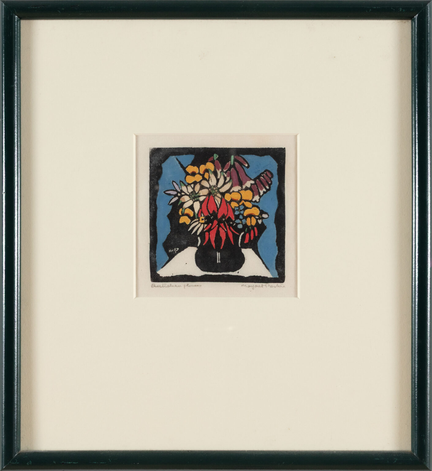 From the time of her first exhibition in 1925 Margaret Preston established herself as the most important artist printmaker working in Australia. The exhibition received critical and popular acclaim. It was described in the press as ‘a riot of colour’ and sold exceptionally well. The most desirable works were those dealing with Australian flora; Preston hand-coloured them in gouache which enabled her to exploit the effects of vibrant, saturated colours. Her work quickly became iconic, being illustrated in journals like Art in Australia and The Home and being acquired by public galleries.  The exhibition also marked the beginning of Preston’s commitment to the development of a national Australian art.