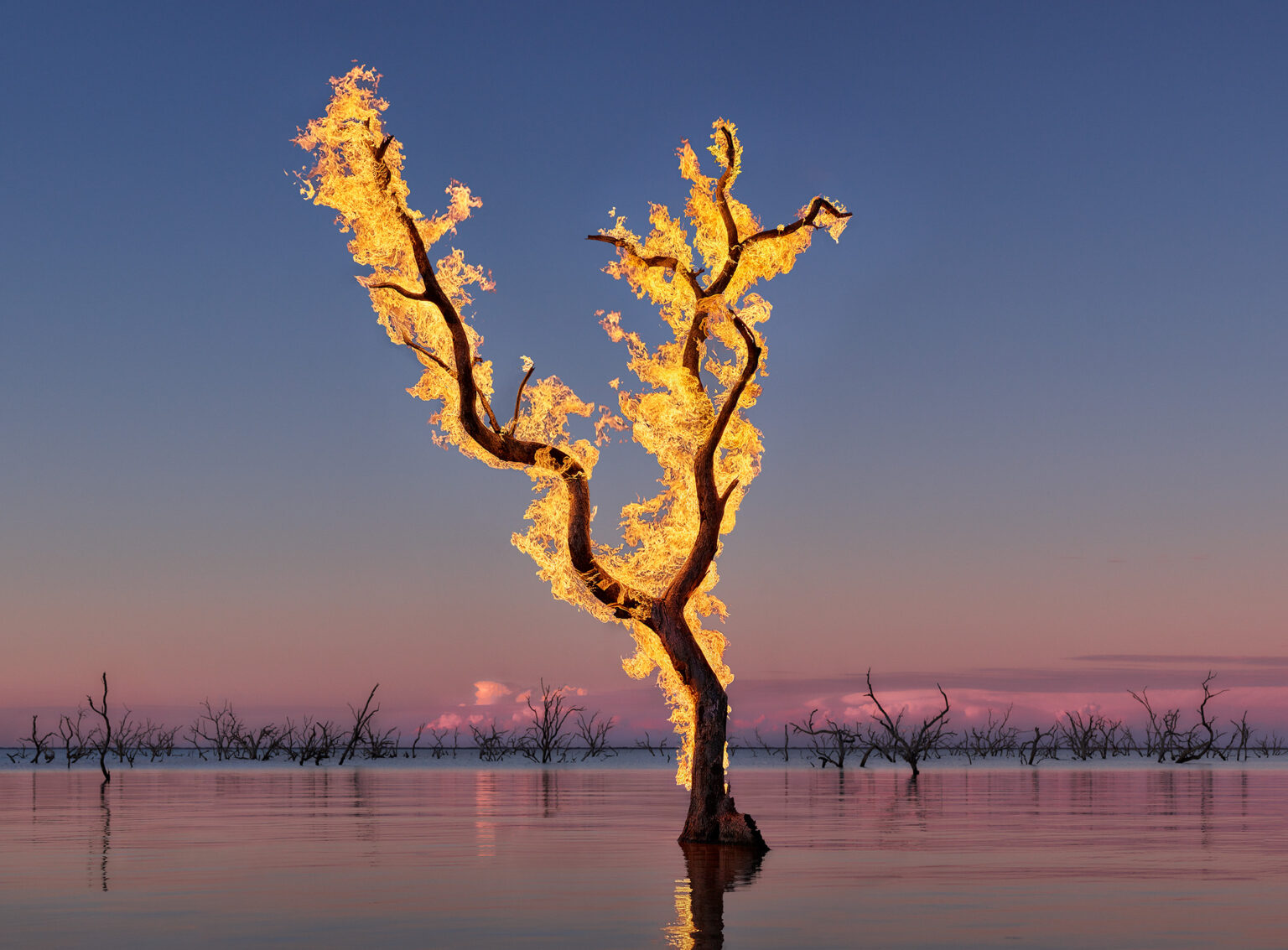 Blaze marked a shift from observing unstable conditions to introducing a controlled intervention. The work was situated within ephemeral and fragile inland river systems. These were temporary landscapes that appear briefly under specific conditions before receding again. The flame was generated through concealed, flexible gas lines wired along the backs of the trees in a sculptural line that outlined their form. The intervention was carefully managed and non-destructive, designed to exist only for the duration of the image. Like the waterways themselves, the fire was temporary. Both were transient states that briefly defined the landscape before disappearing.