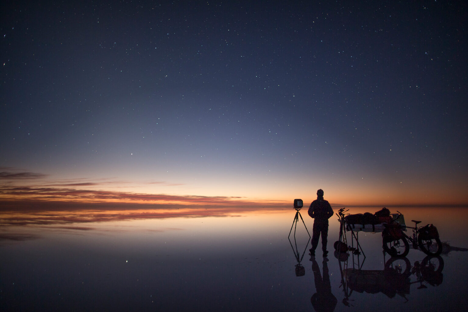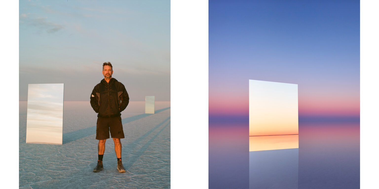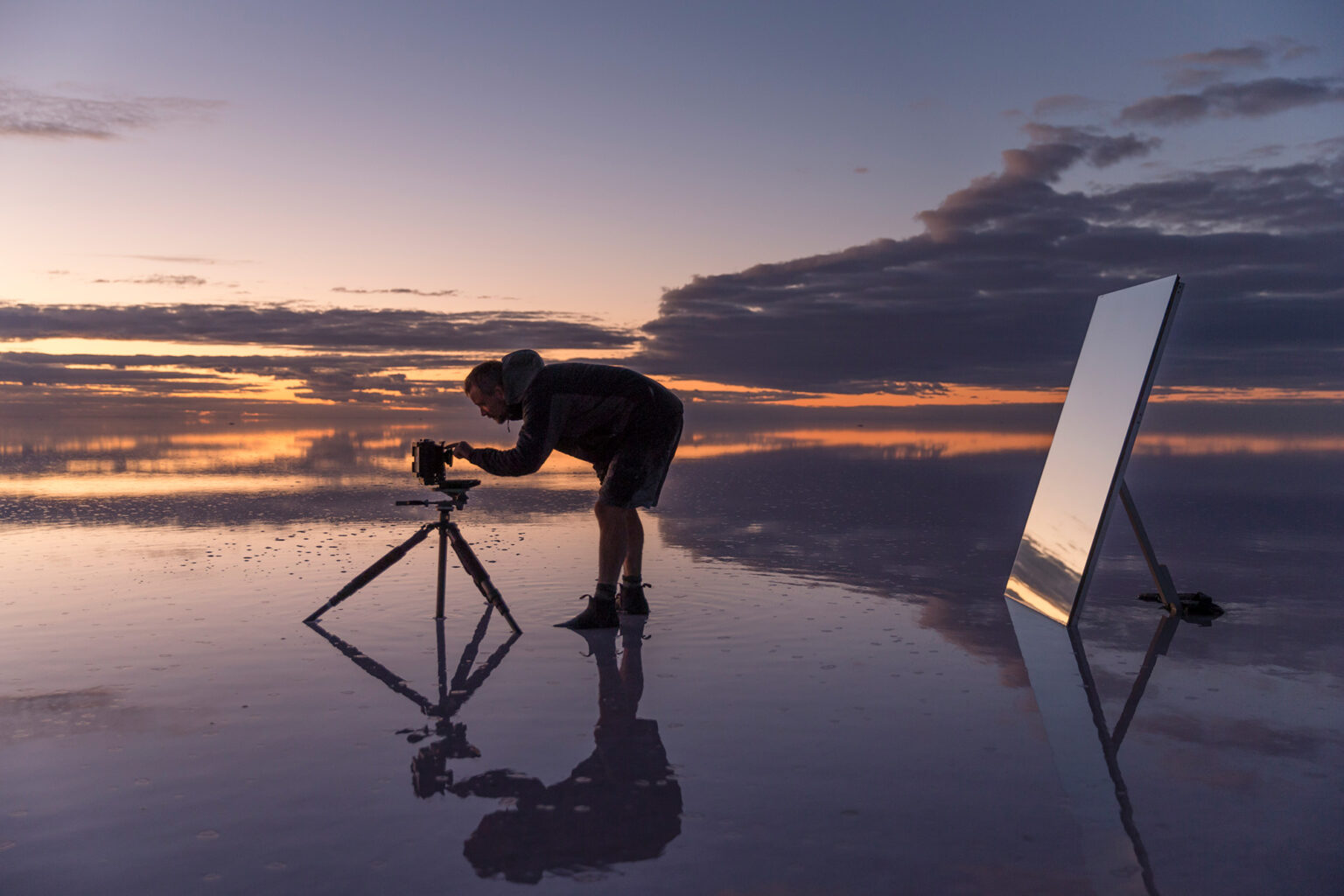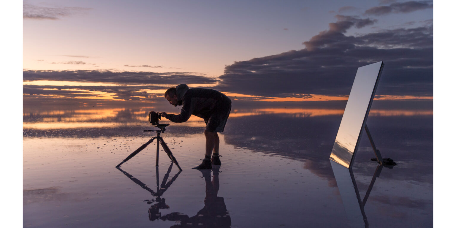 The lake itself imposed continual challenges. The most compelling conditions often occurred when rainwater lay in vast shallow pools across the salt. I would transport a picnic table on a trolley to create a stable platform. The salt, far more corrosive than seawater, required constant protection of equipment; mirrors demanded continual cleaning and polishing. Water sometimes had to be hauled across distances of up to 35 kilometres. Yet living alone on the lake was, paradoxically, peaceful and sustaining.