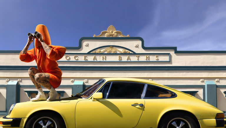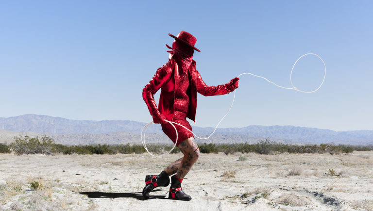 The photographic works within the series Mustang — presented for the first time alongside both moving image and textile-based artworks — form part of an imaginary queer blockbuster. Cinematic stills in which a single faceless hero-cum-heartthrob shifts through a wardrobe of camp costumes and stages a series of cinematic clichés.