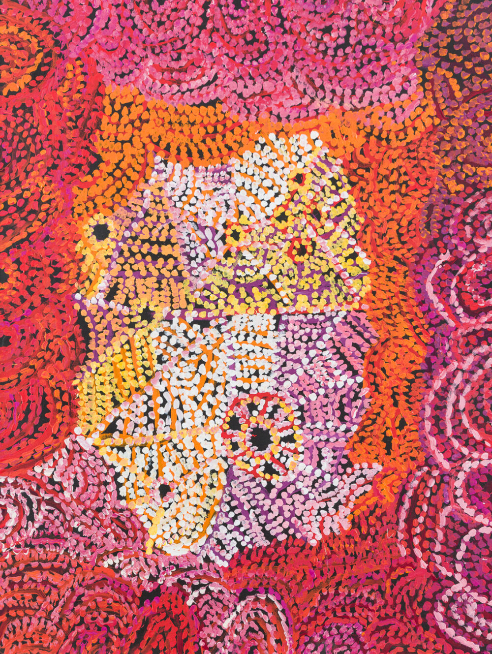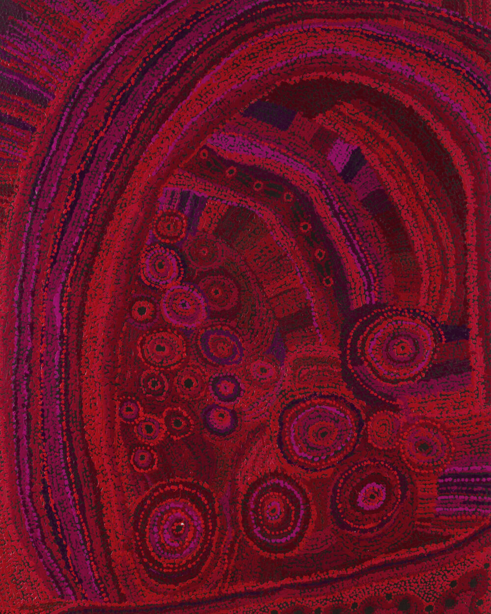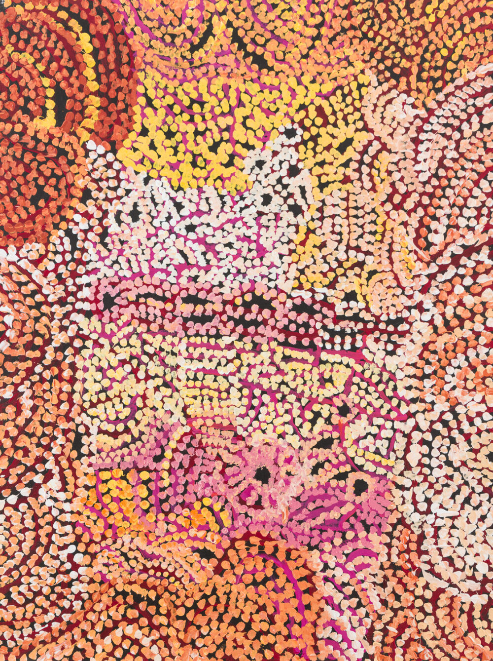 One of the most senior women in her community, Emily Cullinan has been an integral part of the Iwantja art scene for many years and recently experienced a major breakthrough in her practice. Her vibrant paintings are inspired by memories of travelling vast distances on foot across APY Lands with her family.
