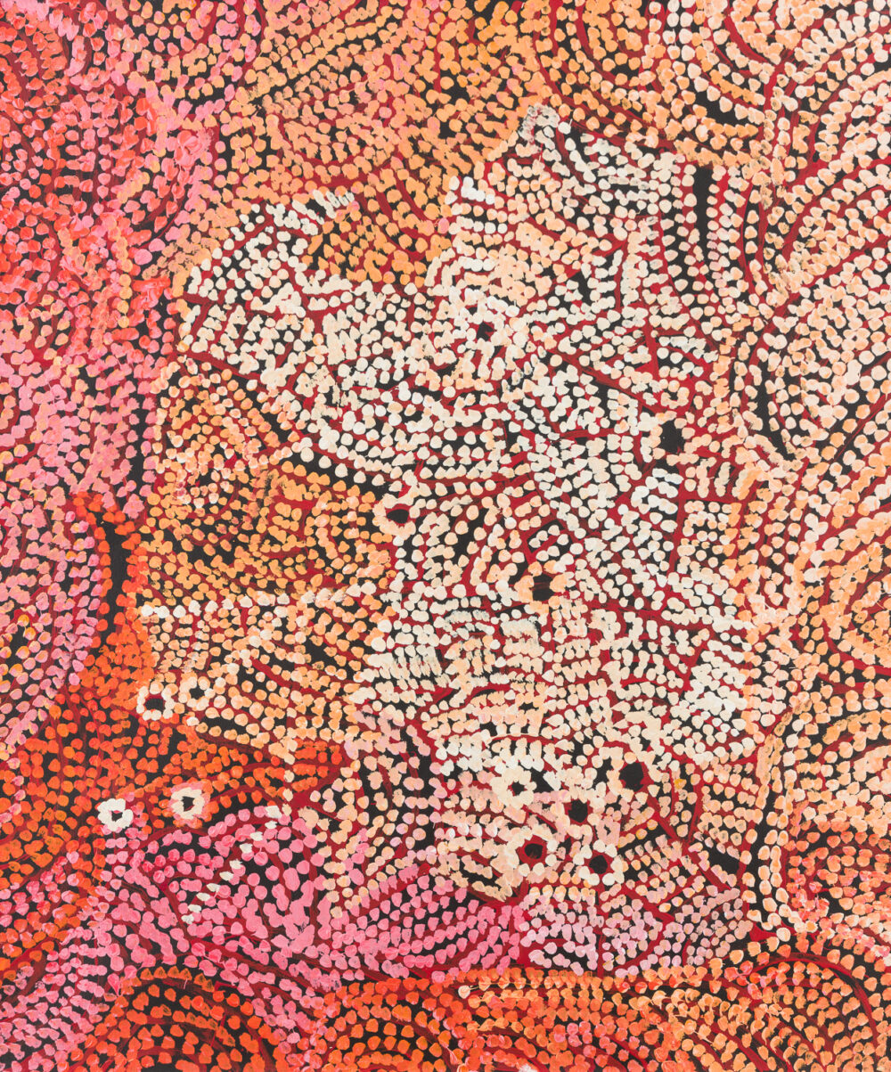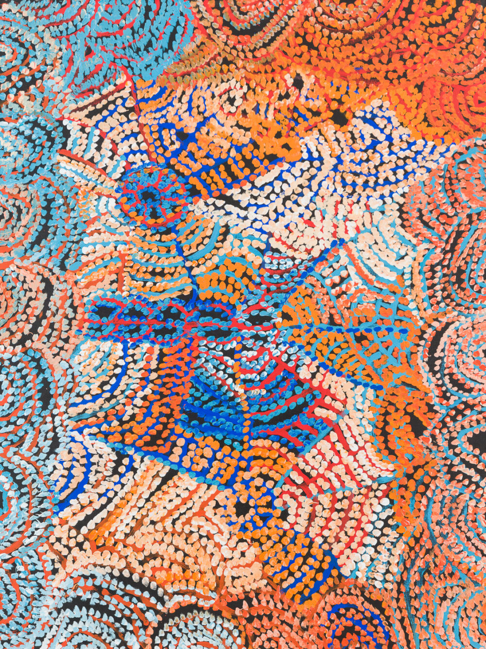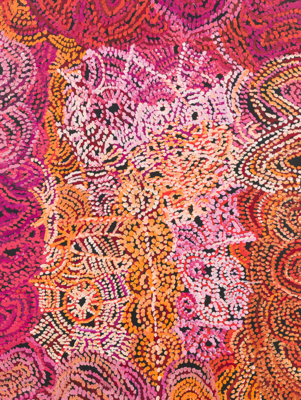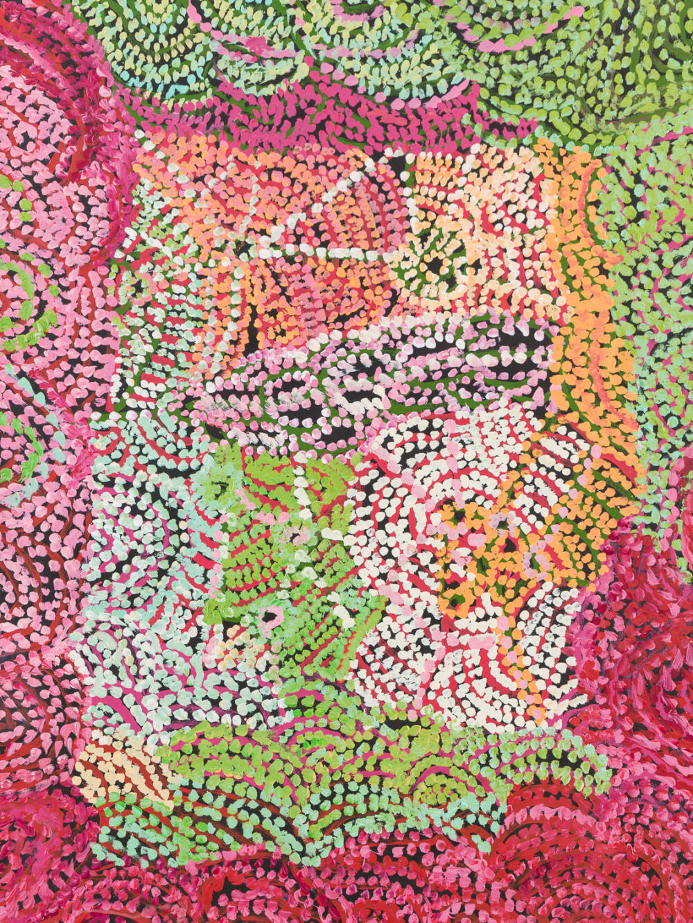 One of the most senior women in her community, Emily Cullinan has been an integral part of the Iwantja art scene for many years and recently experienced a major breakthrough in her practice. Her vibrant paintings are inspired by memories of travelling vast distances on foot across APY Lands with her family.