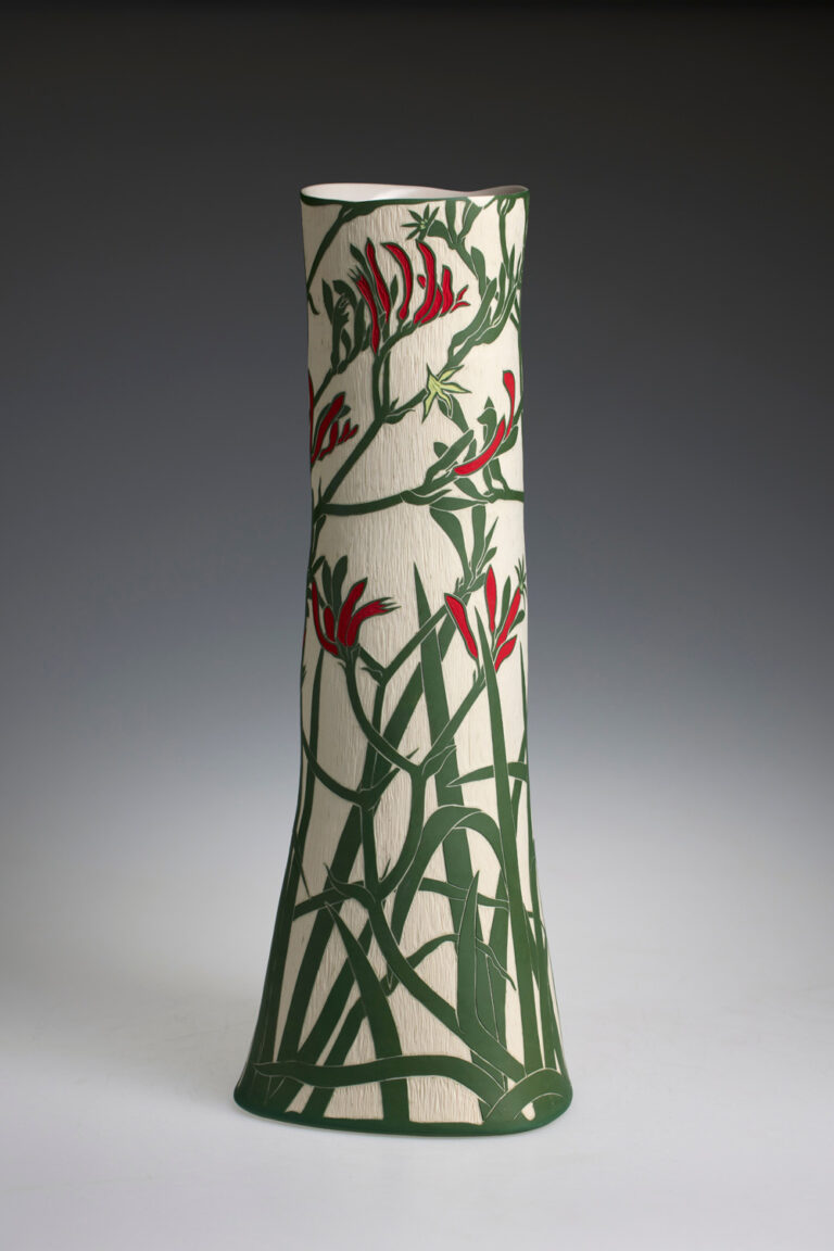 The chunky nature of encaustics, a blend of beeswax and dammar resin, proves ideal for Le Cerf’s rugged terrains. The artist attributes her love of these landscapes to her parents, with whom she moved to Perth from the UK, when she was five. The family would spend time camping and exploring in nature. “They were fed the Leyland Brothers growing up, and that’s what Australia was all about to us!” she says.