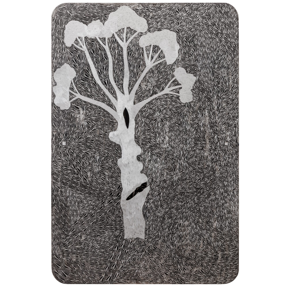 Gaypalani Wanambi‘s father Mr. W. Wanambi made sure that she was a major part of his highly successful career from when she was young. He tutored her in her law and encouraged her to paint in her own right as well as assisting him in his work. After his death out of respect for him she eschewed the themes of spirit fish in the waters of Trial Bay and instead describes the journeys of the ancestral honey hunter and the bees hiding in hollows in the stringybark.