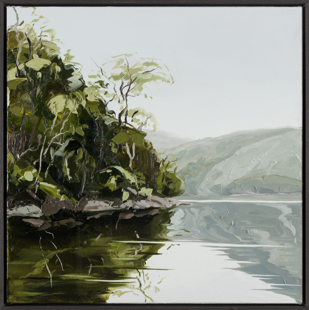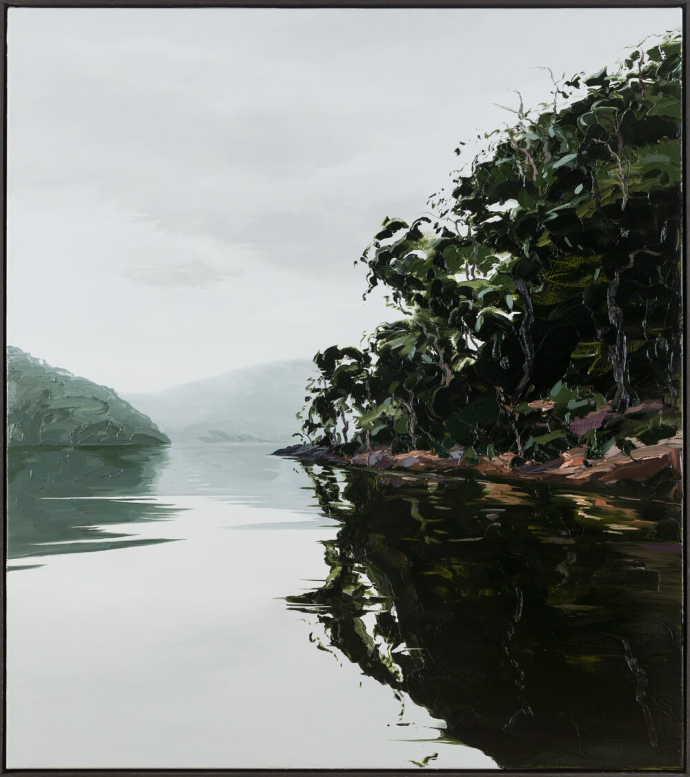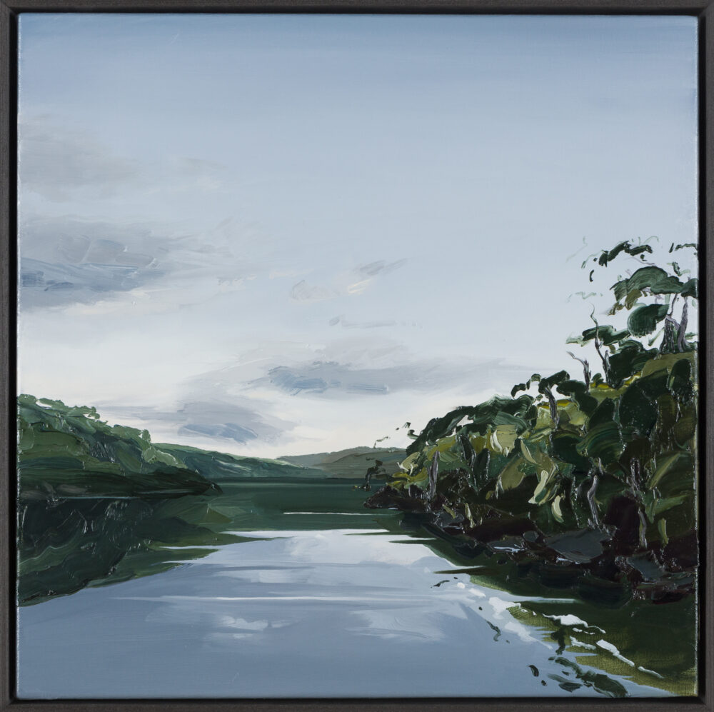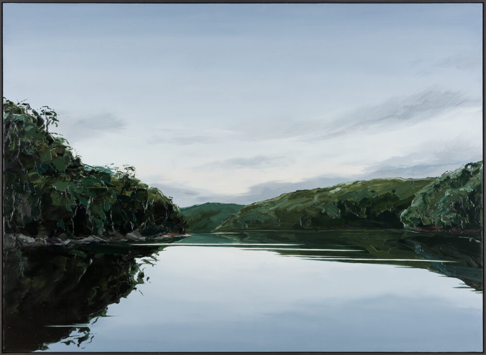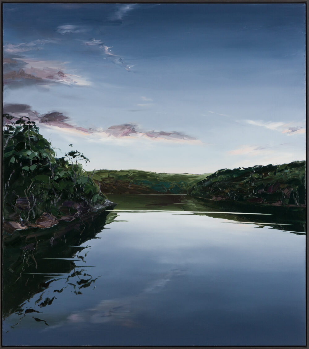In her newest exhibition, Julz Beresford explores changing light over the Hawksbury River, treating audiences to her exquisite renderings of dusk and dawn. Beresford’s paintings are awash with Romantic sensibilities, sending the viewer on a journey through glassy, rippling waterways that snake through tangles of bush and tumbling sandstone.