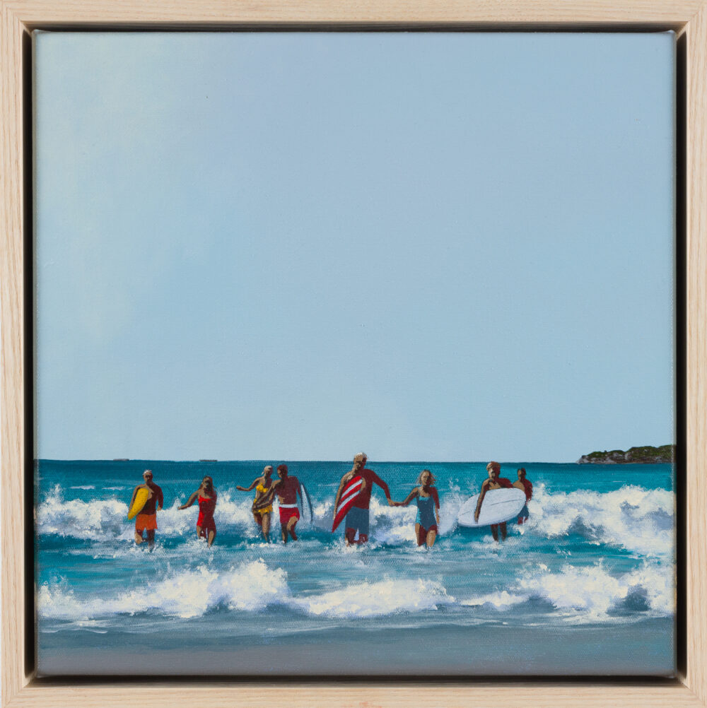 I found myself returning to the idea of connectedness. This narrative is very much reflective of where my painting practice is at right now. I’ve been increasingly interested in how to distil emotion and narrative into subtle gestures – whether through the choice of colour, the layering of translucent paint or the interplay between the figure and the fabric. My process has become more focused on simplicity and restraint, which I believe allows the emotional depth of the work to emerge more fully. I find that by limiting myself to a sparse colour palette and minimal use of paint, I’m able to concentrate on the nuances of form and feeling. This focus on the push and pull of human connection is something that runs through the entire collection.