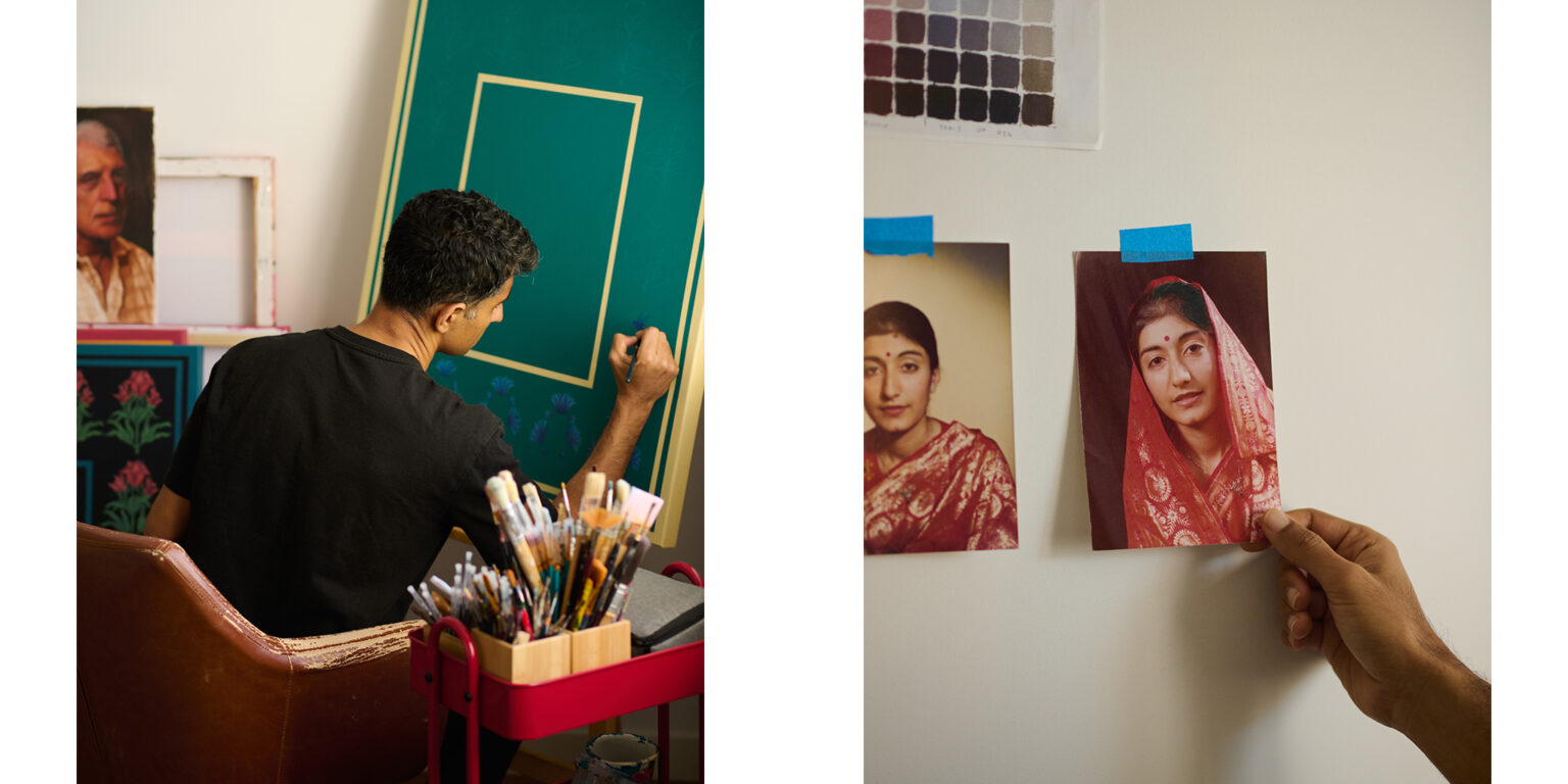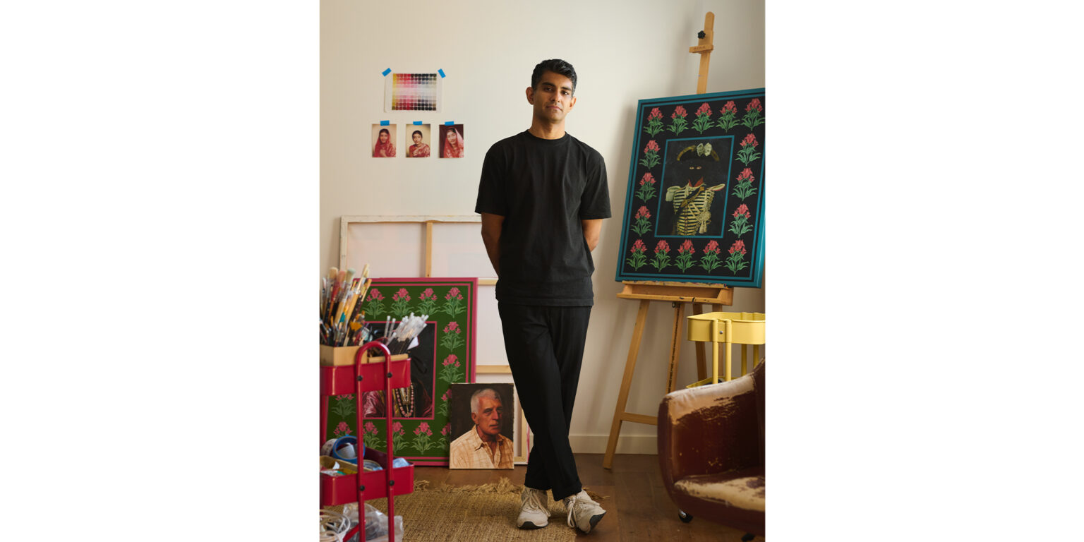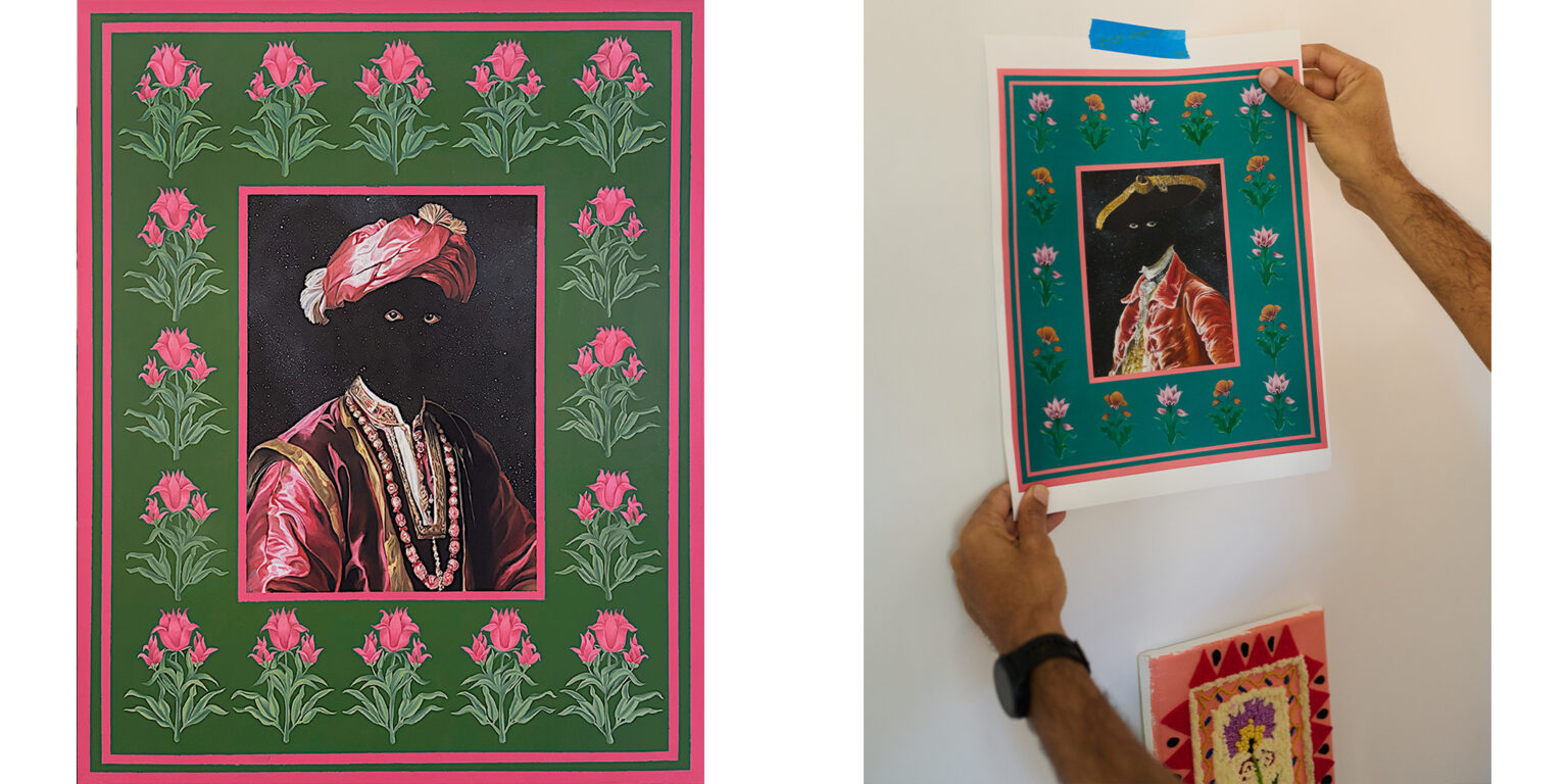 Growing up between cultures, I was surrounded by rich but conflicting visual languages – everything from Bollywood posters and Indian textiles to the Western art we studied in school. Early on, I was drawn to the intricacy and symbolism of Indian miniature painting, but it wasn’t until much later that I understood its colonial entanglements. These influences still underpin my practice today. I’m interested in how aesthetics shaped under empire can be reclaimed and reconfigured to tell new stories – stories about migration, memory and identity.