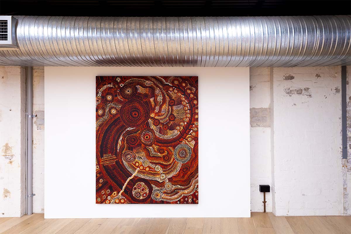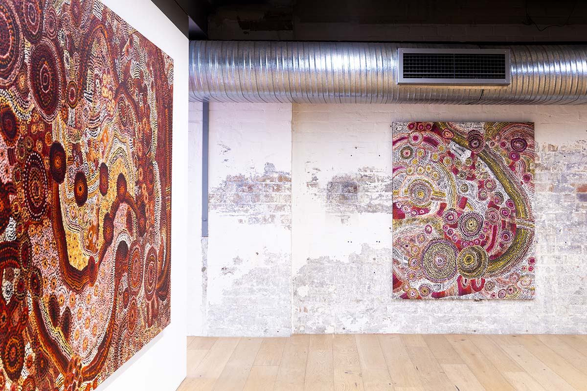 Anchoring the two sisters’ joint exhibition, Tali Ngura Wiru – Beautiful Sandhill Country, are two newly completed, large-scale diptychs – one by each artist – conceived as twin pillars around which a constellation of vibrant canvases now circulate. Together, these works trace a shared geography while allowing space for individual cadence, colour and mark-making to emerge.