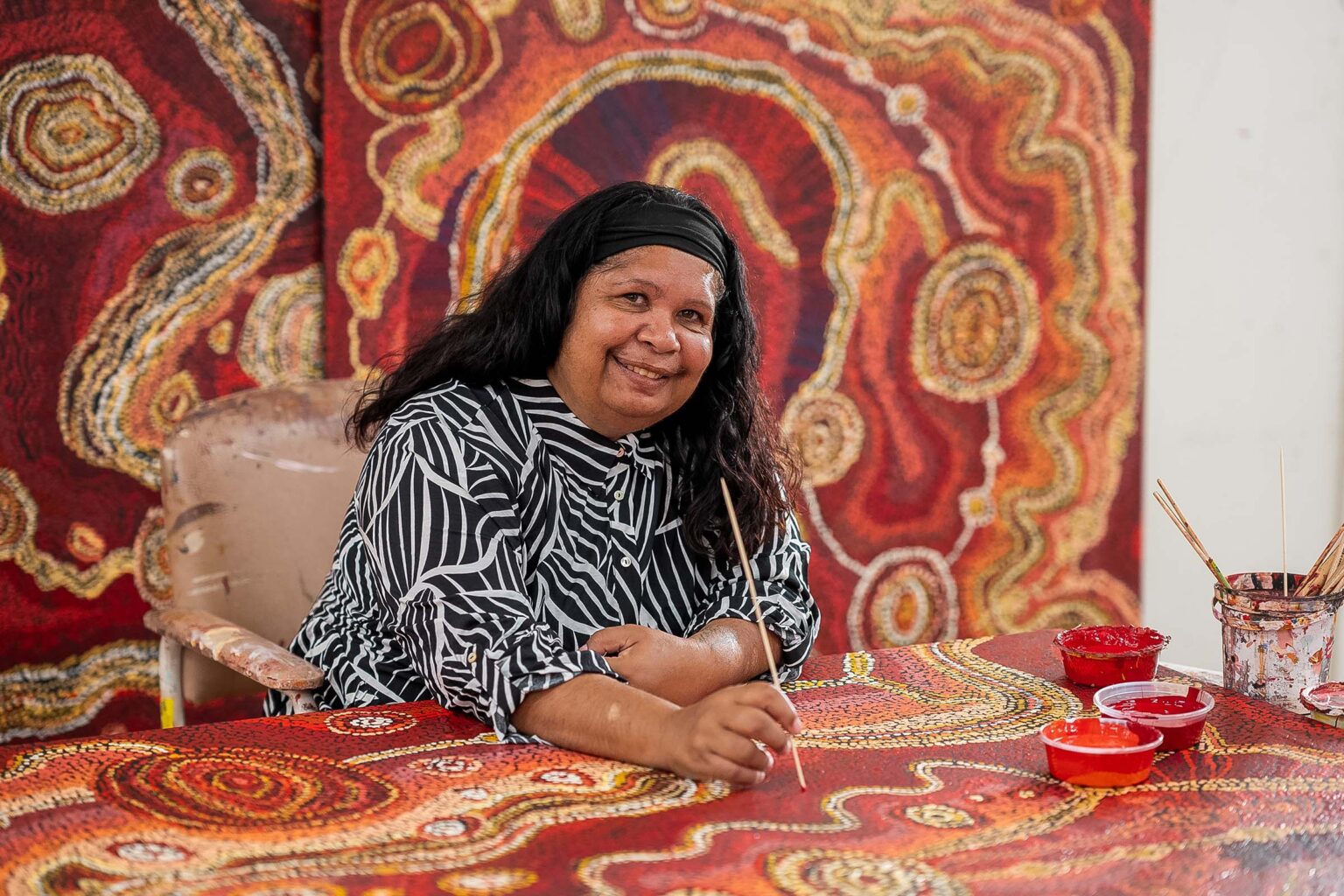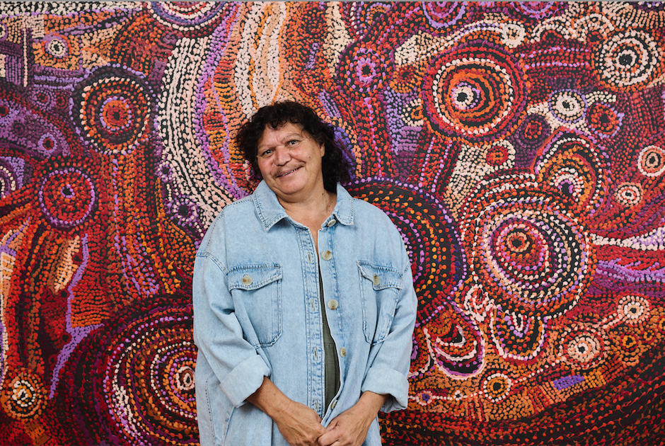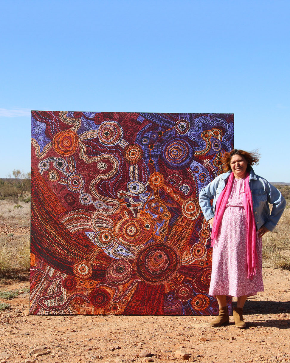 “I’ve been making art since I was a young girl,” says Trisha Singer, who paints Tali Ngura – sandhill Country – on Yankunytjatjara land. “You can see sandhills in the colours I use, desert colours, with dusty reds and oranges. I paint the important places that I know well, that my mother shared with me. There’s a lot of my mum in my work – what she liked and what she taught me. I like looking at different flowers, and going on Country and getting the knowledge of the land, and the story, passed on from grandparents … When you travel, you see the changes in the land. It comes alive.”
