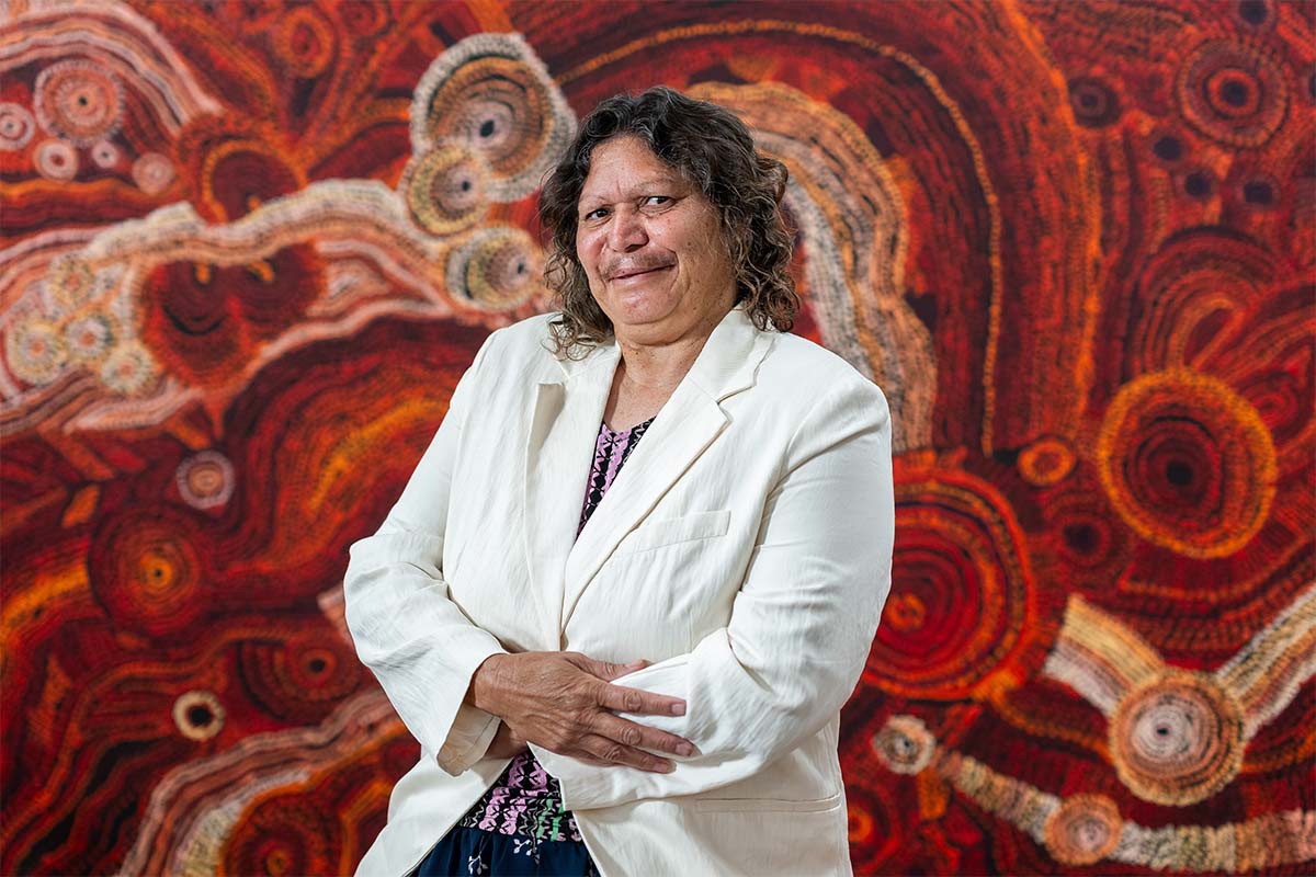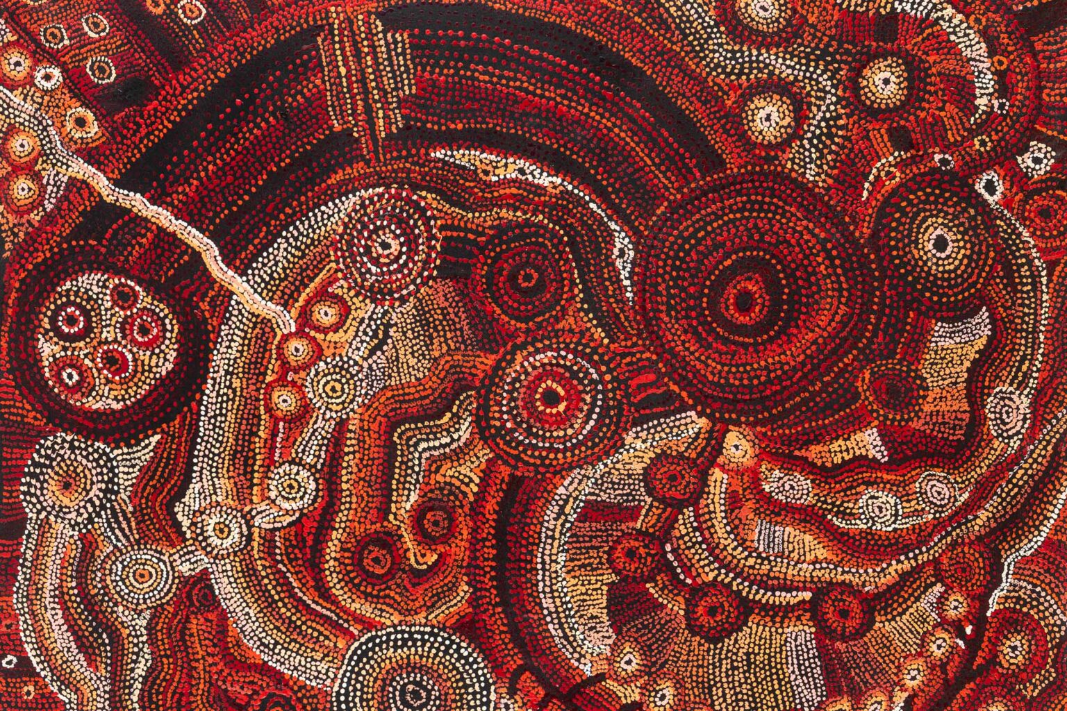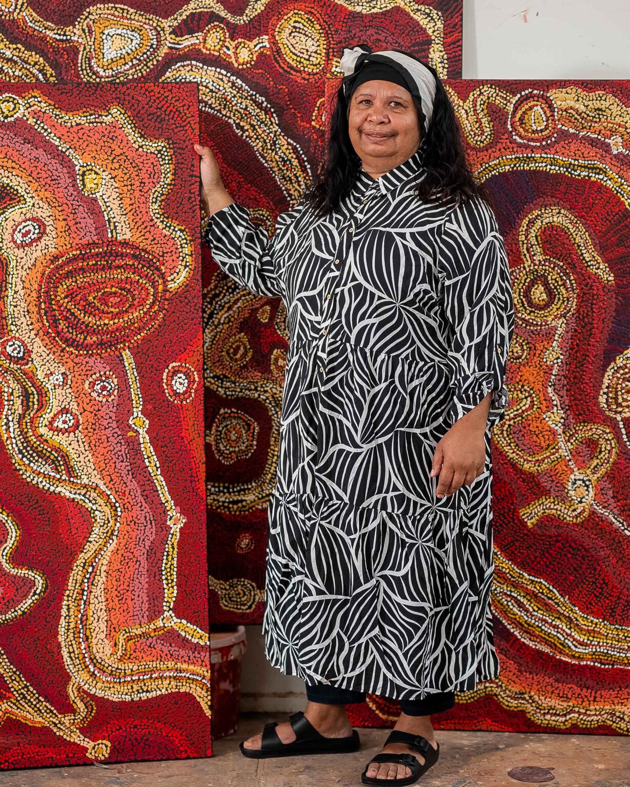 “I’ve been making art since I was a young girl,” says Trisha Singer, who paints Tali Ngura – sandhill Country – on Yankunytjatjara land. “You can see sandhills in the colours I use, desert colours, with dusty reds and oranges. I paint the important places that I know well, that my mother shared with me. There’s a lot of my mum in my work – what she liked and what she taught me. I like looking at different flowers, and going on Country and getting the knowledge of the land, and the story, passed on from grandparents … When you travel, you see the changes in the land. It comes alive.”