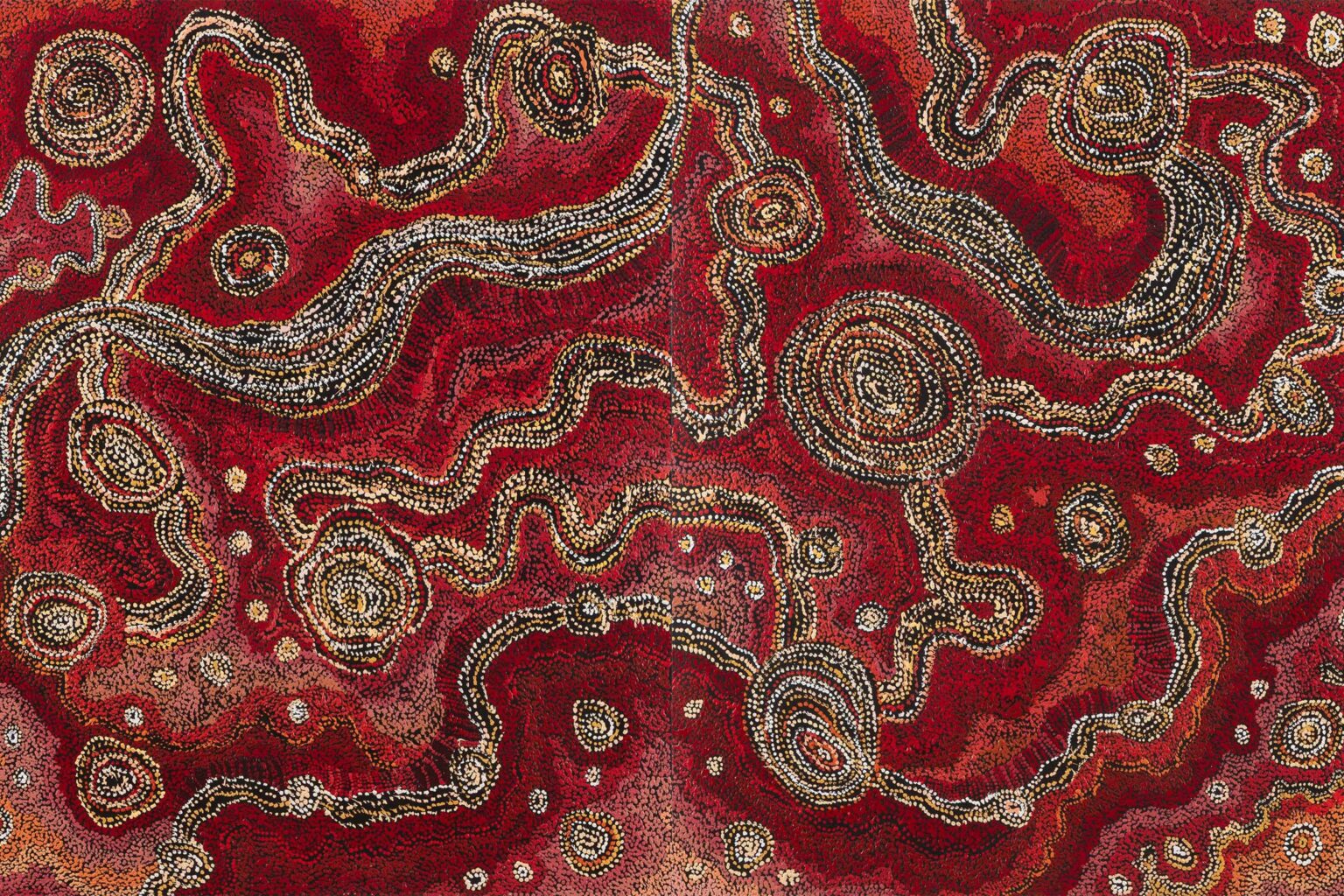 For Priscilla Singer, a senior Pitjantjatjara woman and longstanding leader within the Iwantja community, painting is an act of remembrance, transmission and care. “When I’m painting, I always think about my grandfather’s Country and my mother’s painting. I try to paint the places they travelled around,” she says. “I look to my mum’s painting and show some of that same story in my work. I paint the red sand. The red sand never changes; it is always here. When the sun sets, you can see the glow of the earth. I paint this country so people can see my land, they can appreciate its beauty and understand its power.”