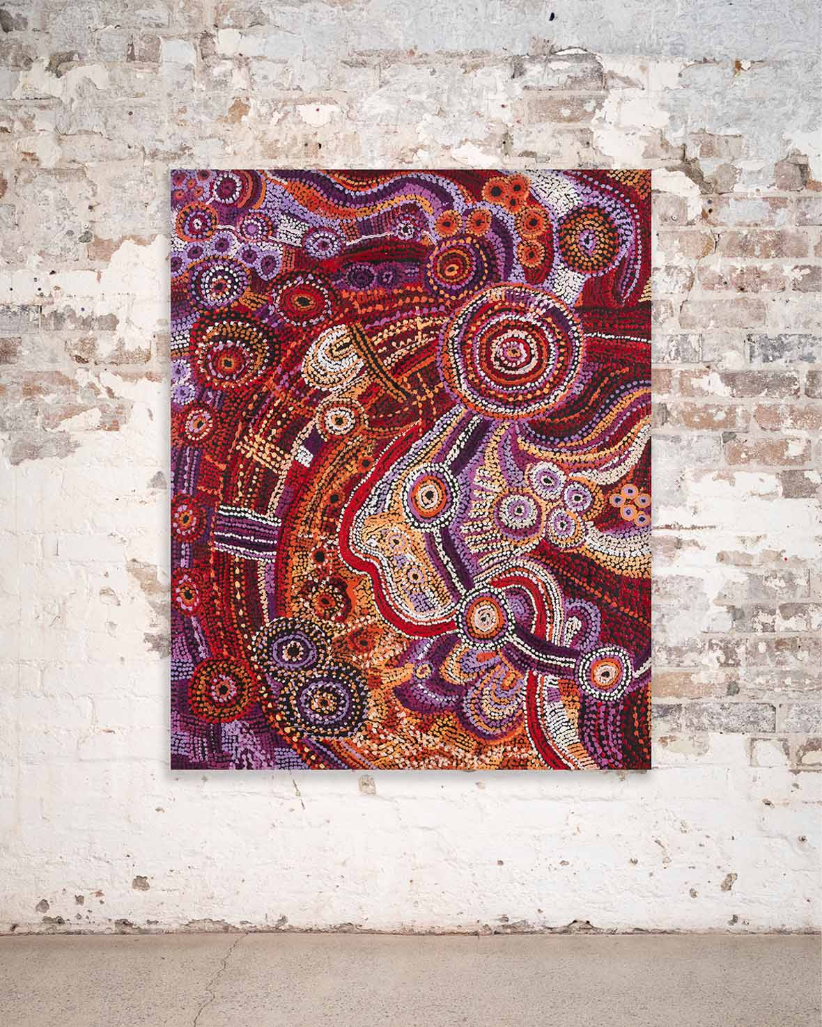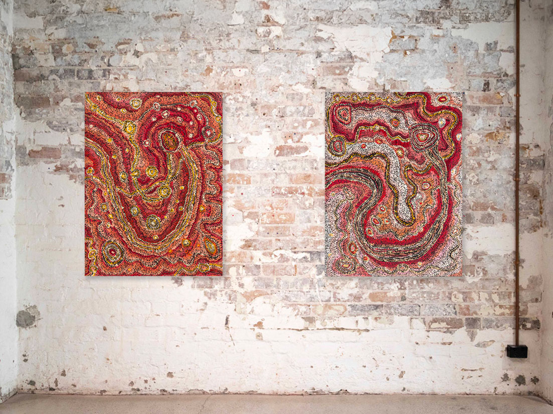 Anchoring the sisters’ joint exhibition, Tali Ngura Wiru – Beautiful Sandhill Country, are two newly completed, large-scale diptychs – one by each artist – conceived as twin pillars around which a constellation of vibrant canvases will circulate. Together, these works trace a shared geography while allowing space for individual cadence, colour and mark-making to emerge.
