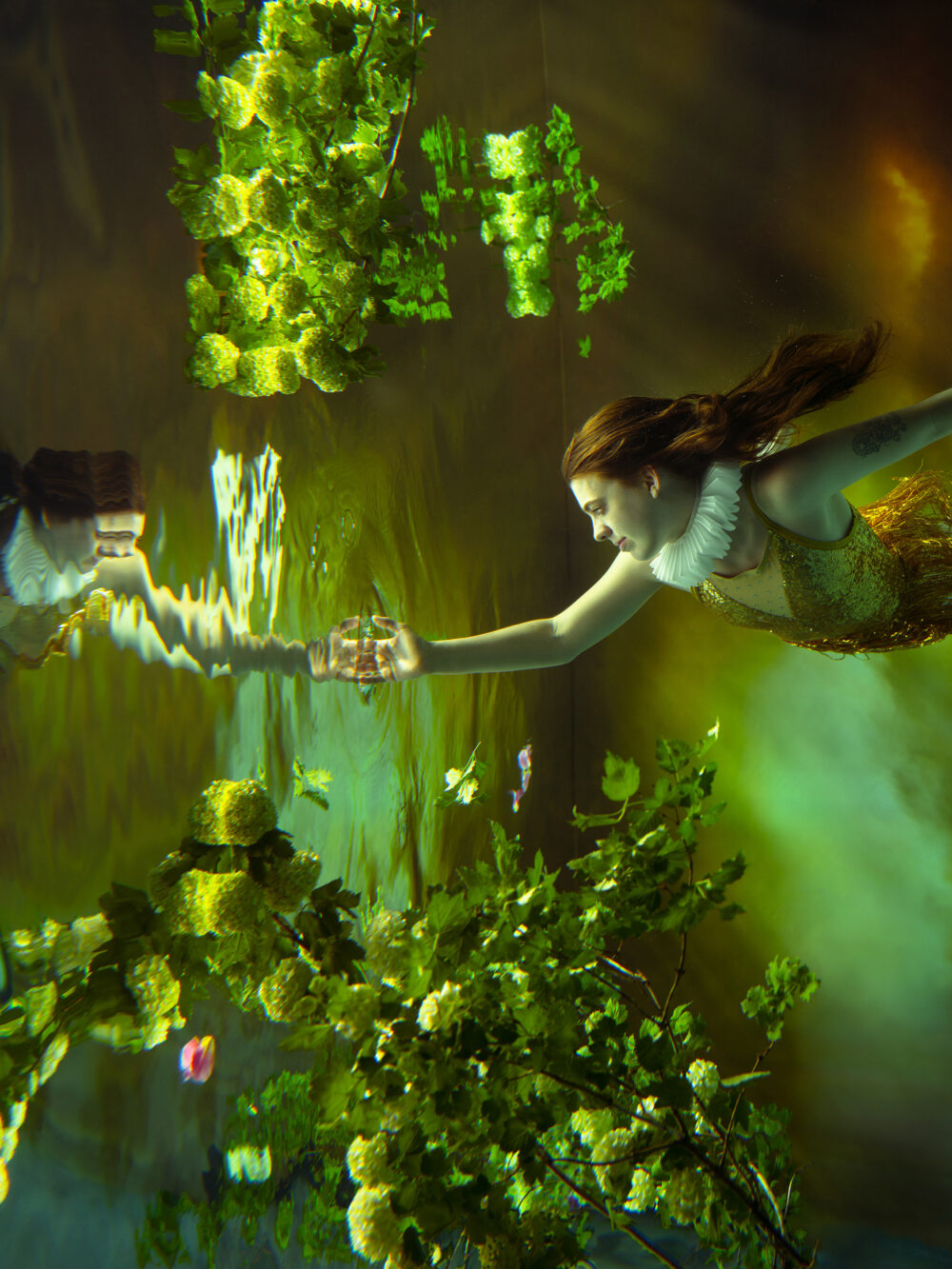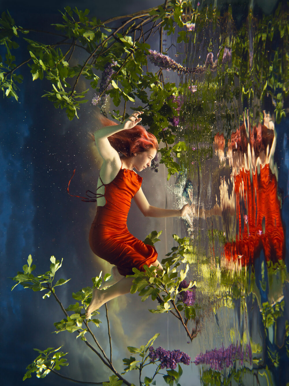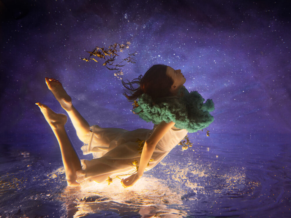 While Dean’s fecund fantasias might at first appear like digitally conjured dreamscapes, they are, in fact, an extraordinary feat of practical effects, with the artist immersing and lensing her subjects in actual gardens and elaborately constructed underwater sets.