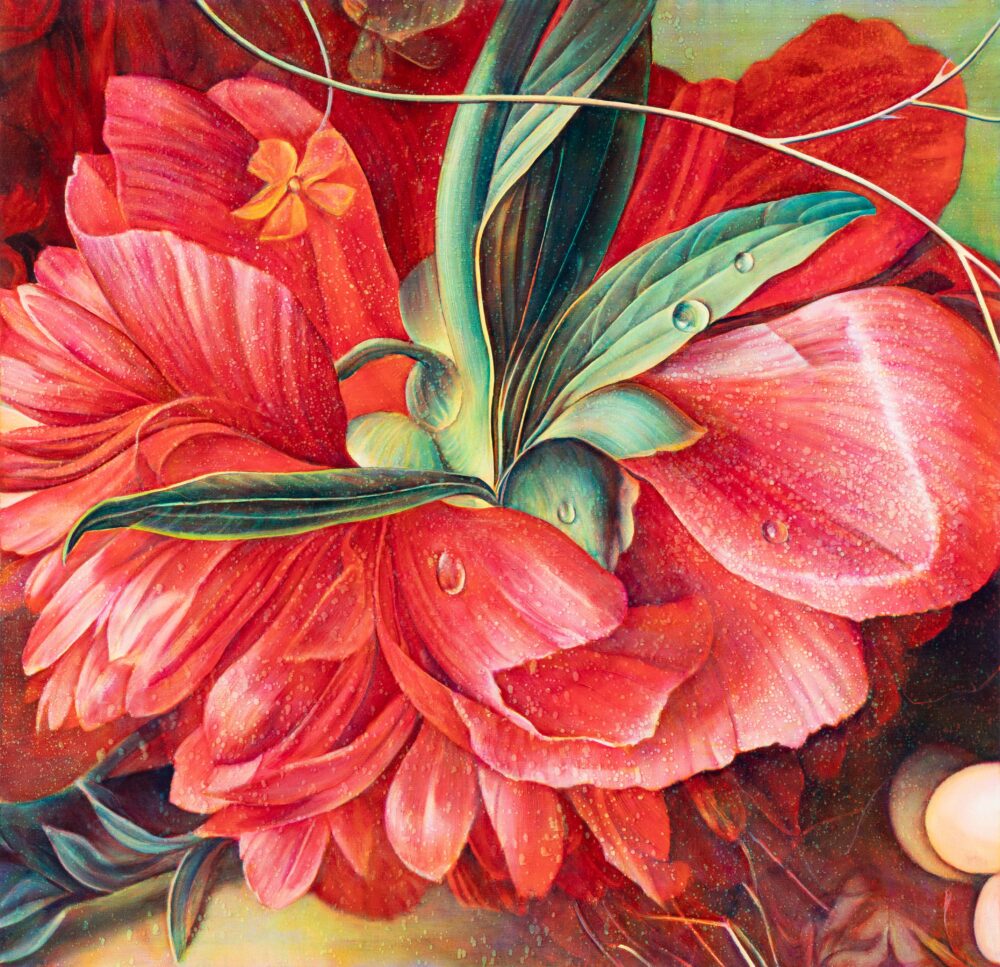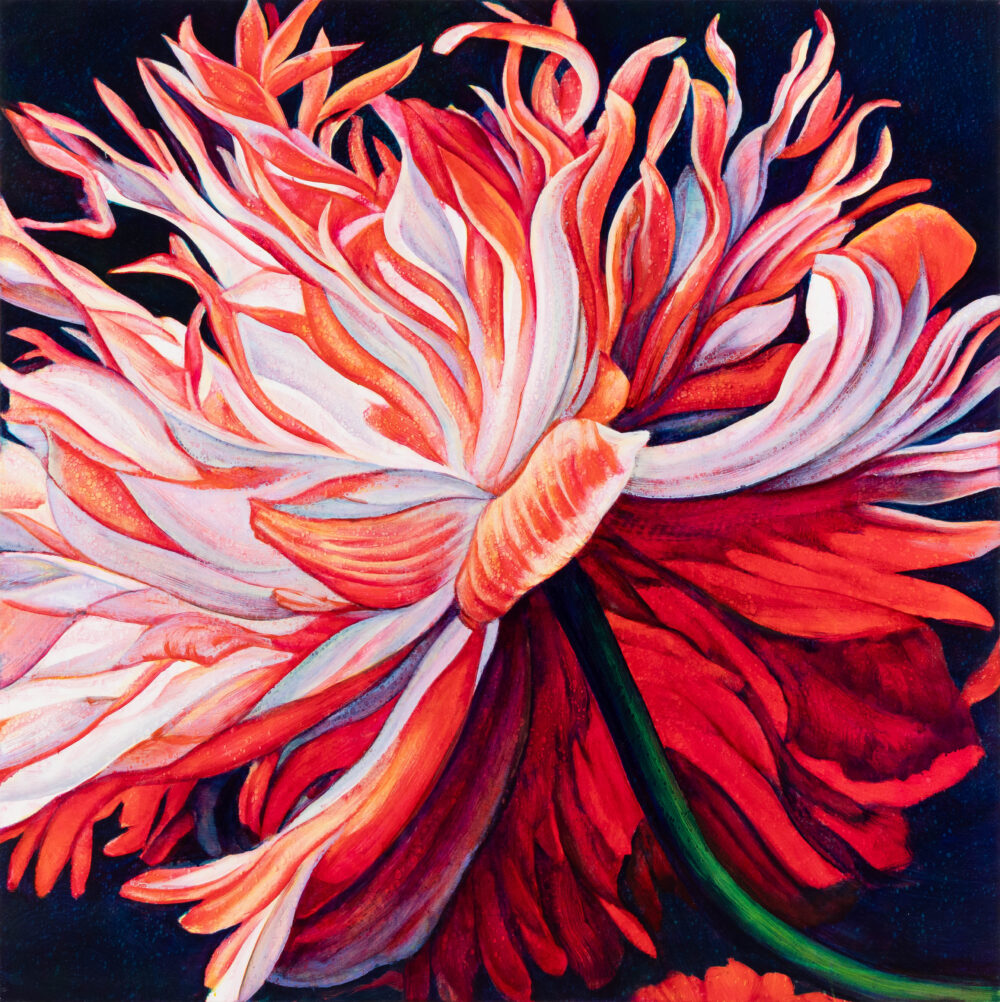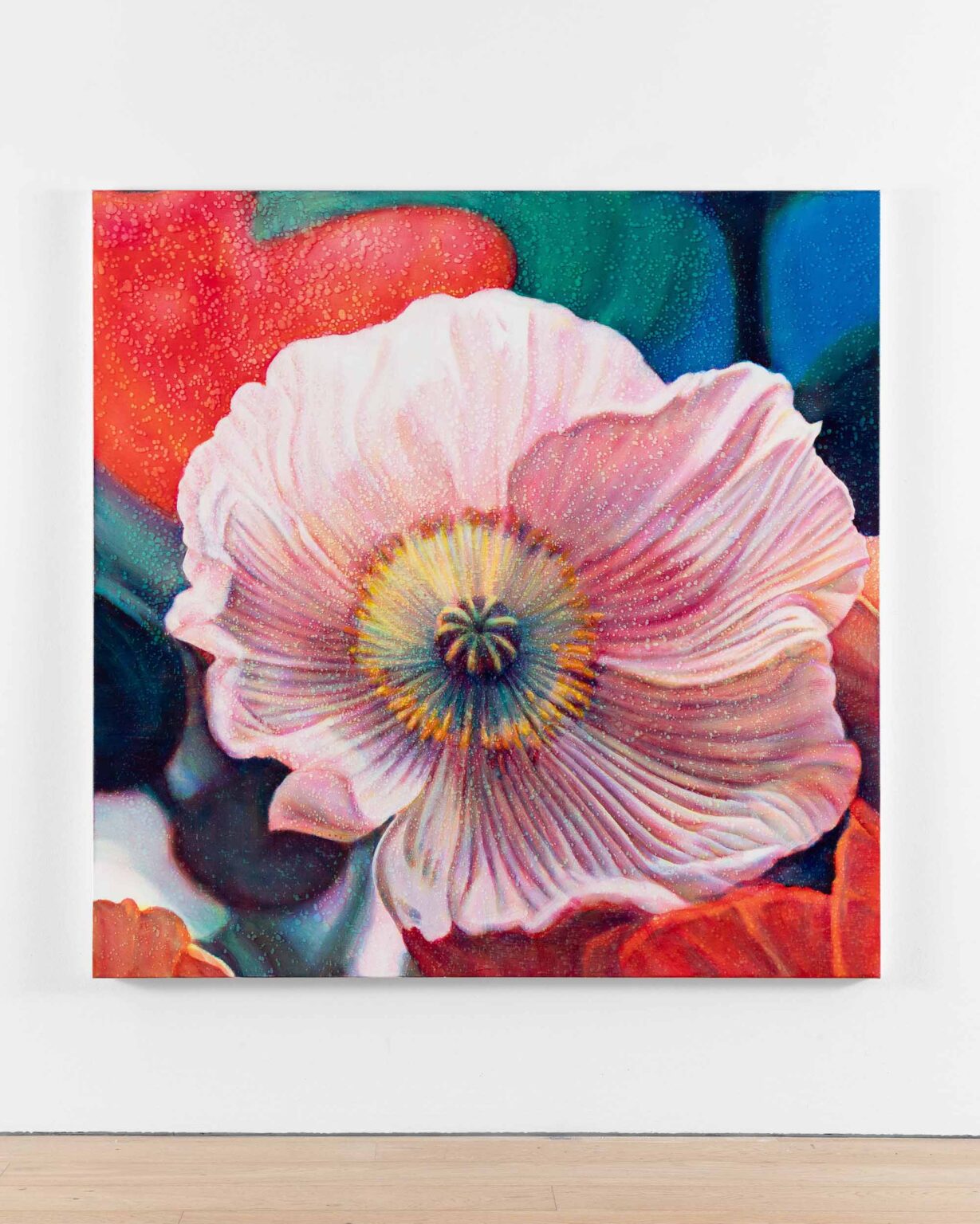 It creates a glowing quality. With opaque paint, light bounces off the surface. With transparent pigment, light passes through, hits the white canvas, and comes back out – like stained glass. So it might look like a painting of a flower, but really it’s a painting of a photograph of a flower. There was always a distance between me and the so-called subject.