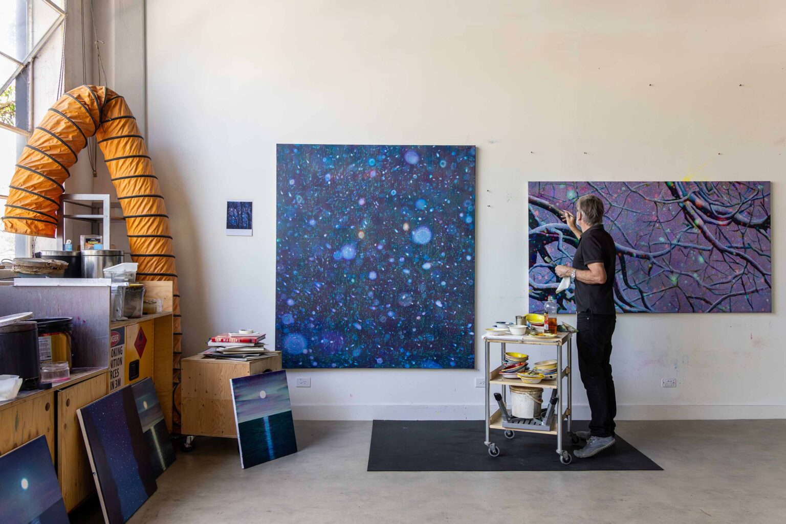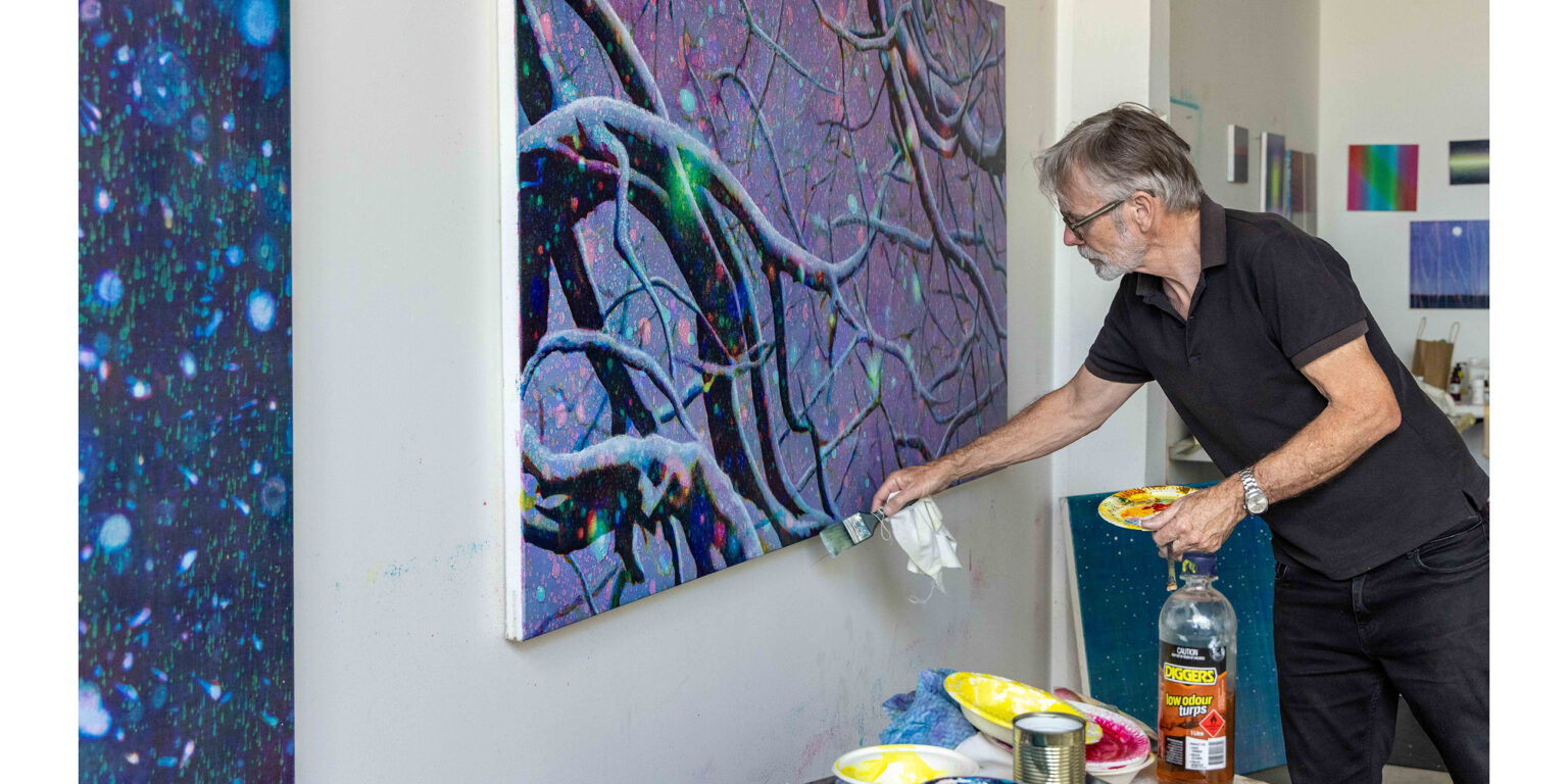 After the Kinglake fires, I took panoramas of the burnt landscape. The twisted branches looked almost nuclear, but in the foreground there was vivid green regrowth. That energy of renewal after such ferocity was incredibly striking. That became the source material for the Kinglake works images – mainly large prints and light boxes, though I’ve also made some paintings from it.