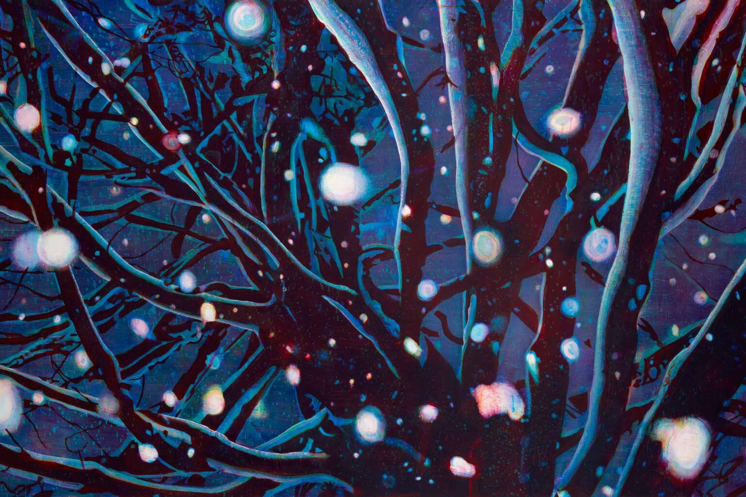 More recently, I revisited canvases of falling snow. I superimposed imagery from the Kinglake photographs – trees and branches – in a way that integrated the snowflakes into the space. The juxtaposition of burnt bush and snow gave the works a strange quality. In paintings where I’d used colour separation, the red, green, and blue snowflakes looked like flying embers or spirits – something ghostly or magical. They refract light, almost like prisms, and can act like little lenses that reveal the forms behind them.