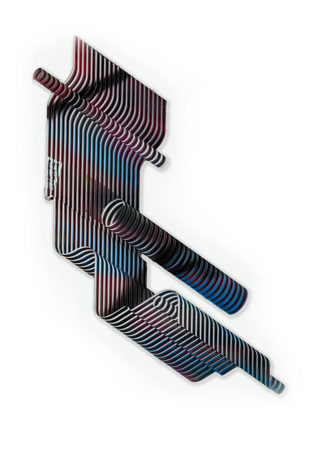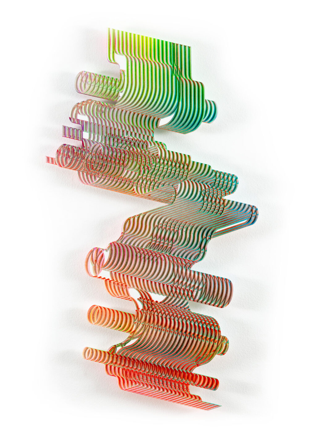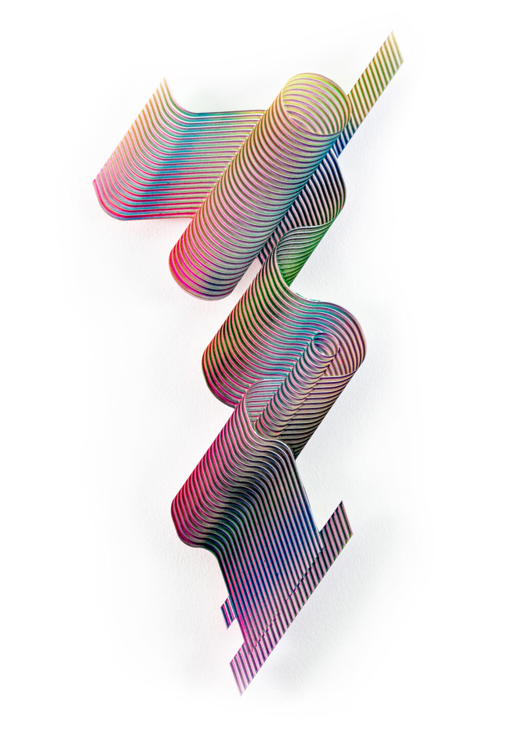 Exploring perceptual shifts in space and time catalysed by new technologies, Richard Blackwell’s dynamic and experimental studio practice melds painting, printmaking, digital automation and analogue fabrication to form graphic compositions in three-dimensional relief. Blackwell’s works envision a future where virtual and tangible worlds are seamlessly intertwined, moving between areas of engineered precision and more nuanced, painterly gestures that impart a softer tactility. While drawing on the bold geometric forms of early modernism, the artist also echoes that era’s optimism for new, machine-age possibilities in his embrace of digital technologies, automation and the glitchy visual cues of our screen-based reality. The high-octane architectural wall works comprising ‘Time On My Hands’ bring a graphic, futurist dimension as they hang alongside a suite of framed works on paper.