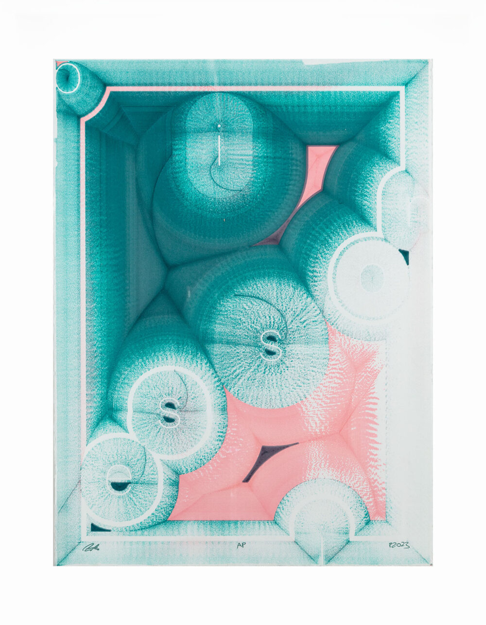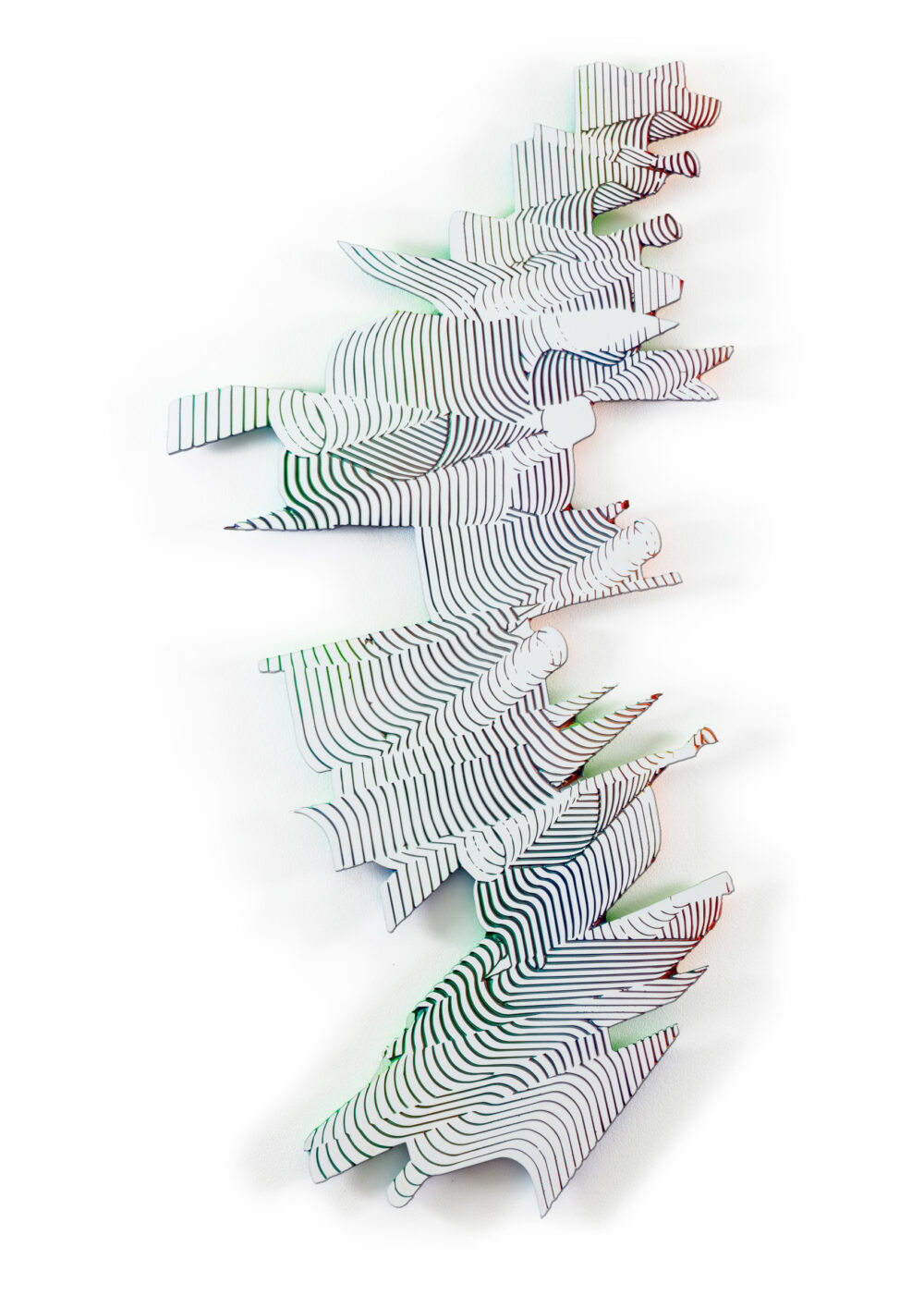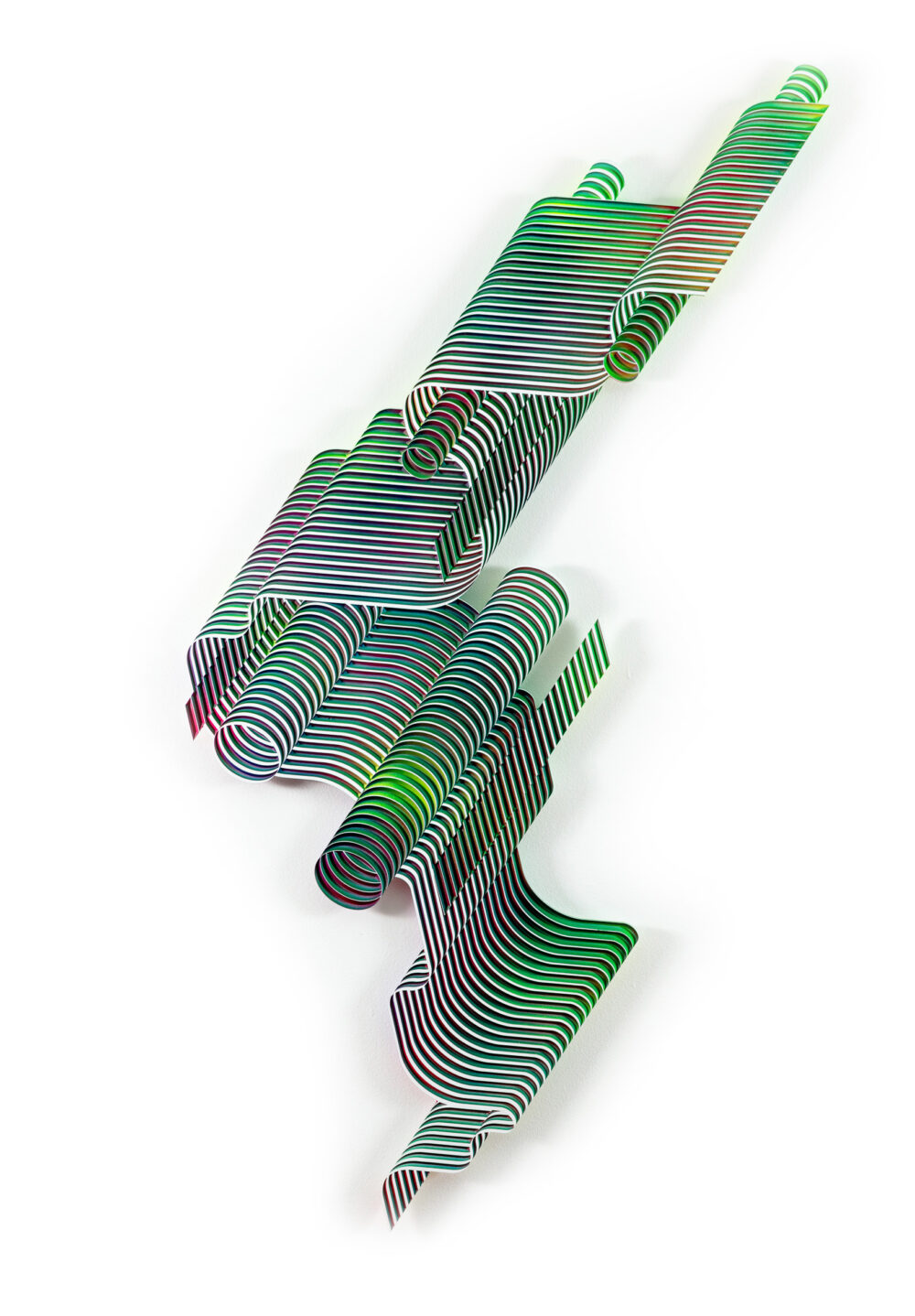 Exploring perceptual shifts in space and time catalysed by new technologies, Richard Blackwell’s dynamic and experimental studio practice melds painting, printmaking, digital automation and analogue fabrication to form graphic compositions in three-dimensional relief. Blackwell’s works envision a future where virtual and tangible worlds are seamlessly intertwined, moving between areas of engineered precision and more nuanced, painterly gestures that impart a softer tactility. While drawing on the bold geometric forms of early modernism, the artist also echoes that era’s optimism for new, machine-age possibilities in his embrace of digital technologies, automation and the glitchy visual cues of our screen-based reality. The high-octane architectural wall works comprising ‘Time On My Hands’ bring a graphic, futurist dimension as they hang alongside a suite of framed works on paper.