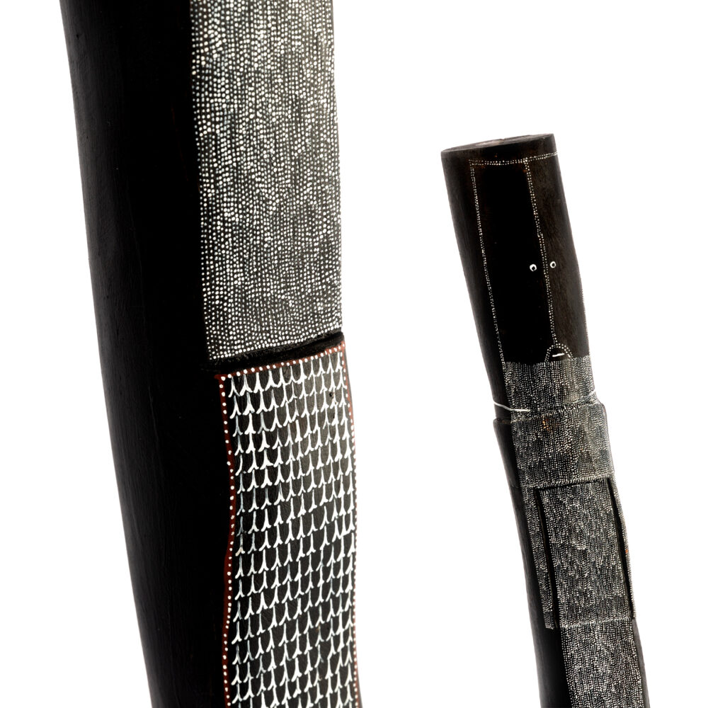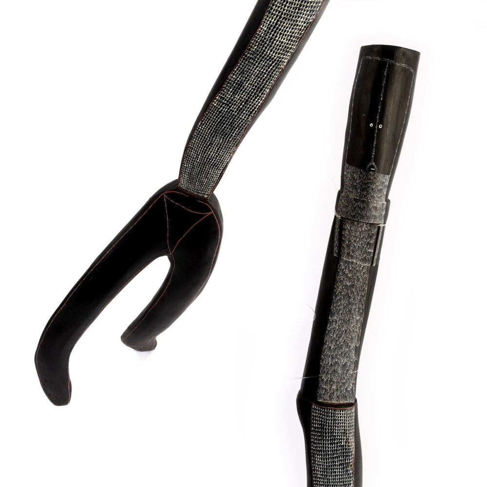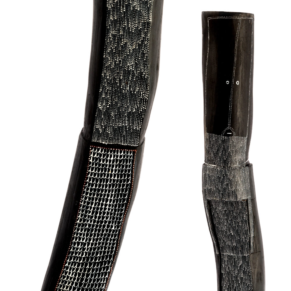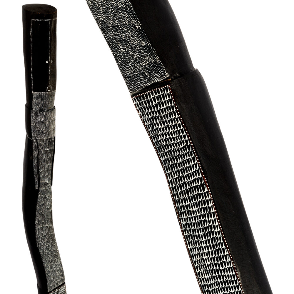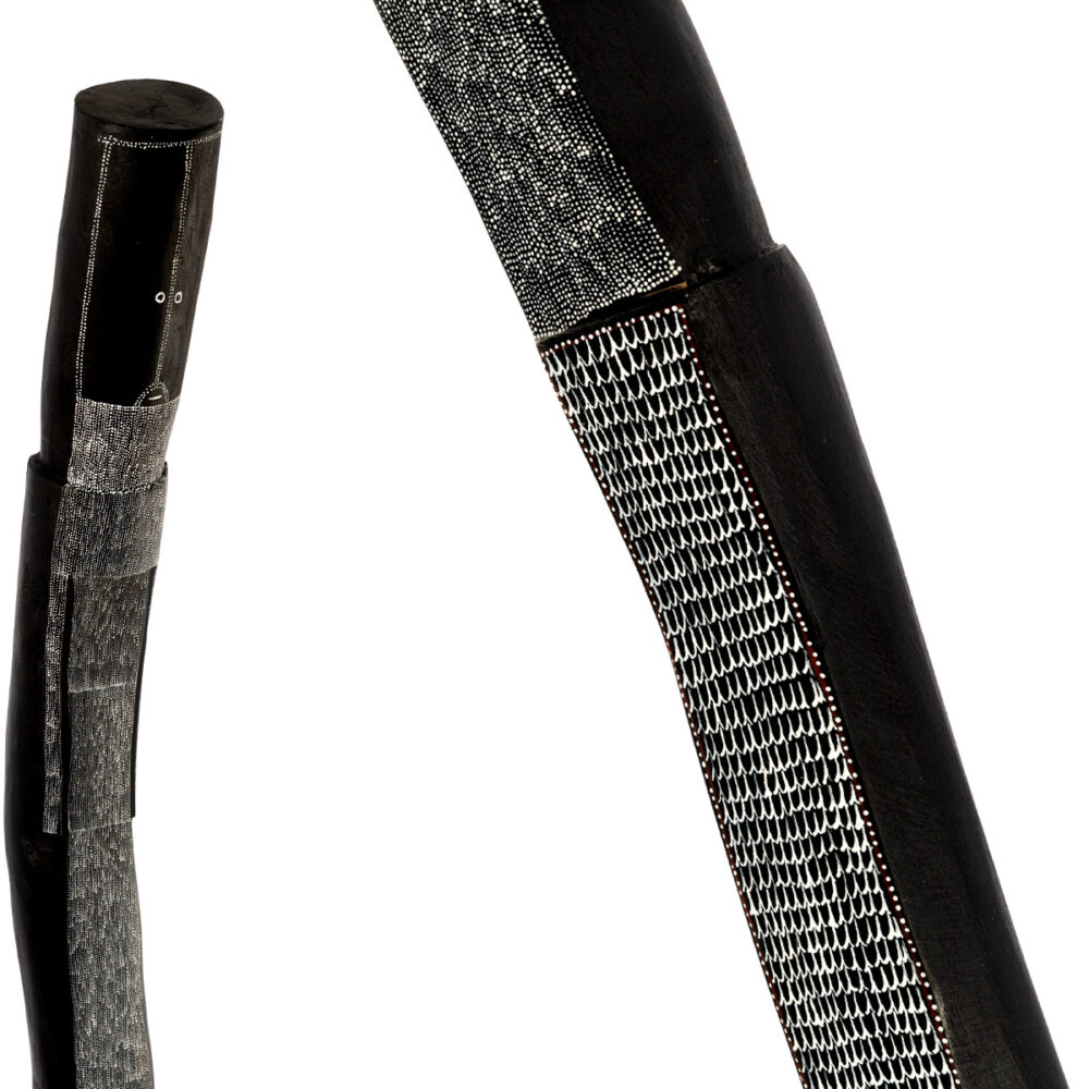 Yawkyawk is a small but very powerful new exhibition by senior Kuninjku artist Owen Yalandja. This is Yalandja’s second exhibition at Michael Reid Sydney this year and is the first to follow his award of the 2023 Telstra Award in the category of bark painting. This milestone achievement has positioned Yalandja as one of Australia’s leading contemporary artists. Owen Yalandja is revered for his exquisite carving and painting skills. Central to the exhibition is the Yawkyawk spirit, which are young female spirits that live in and around waterways.