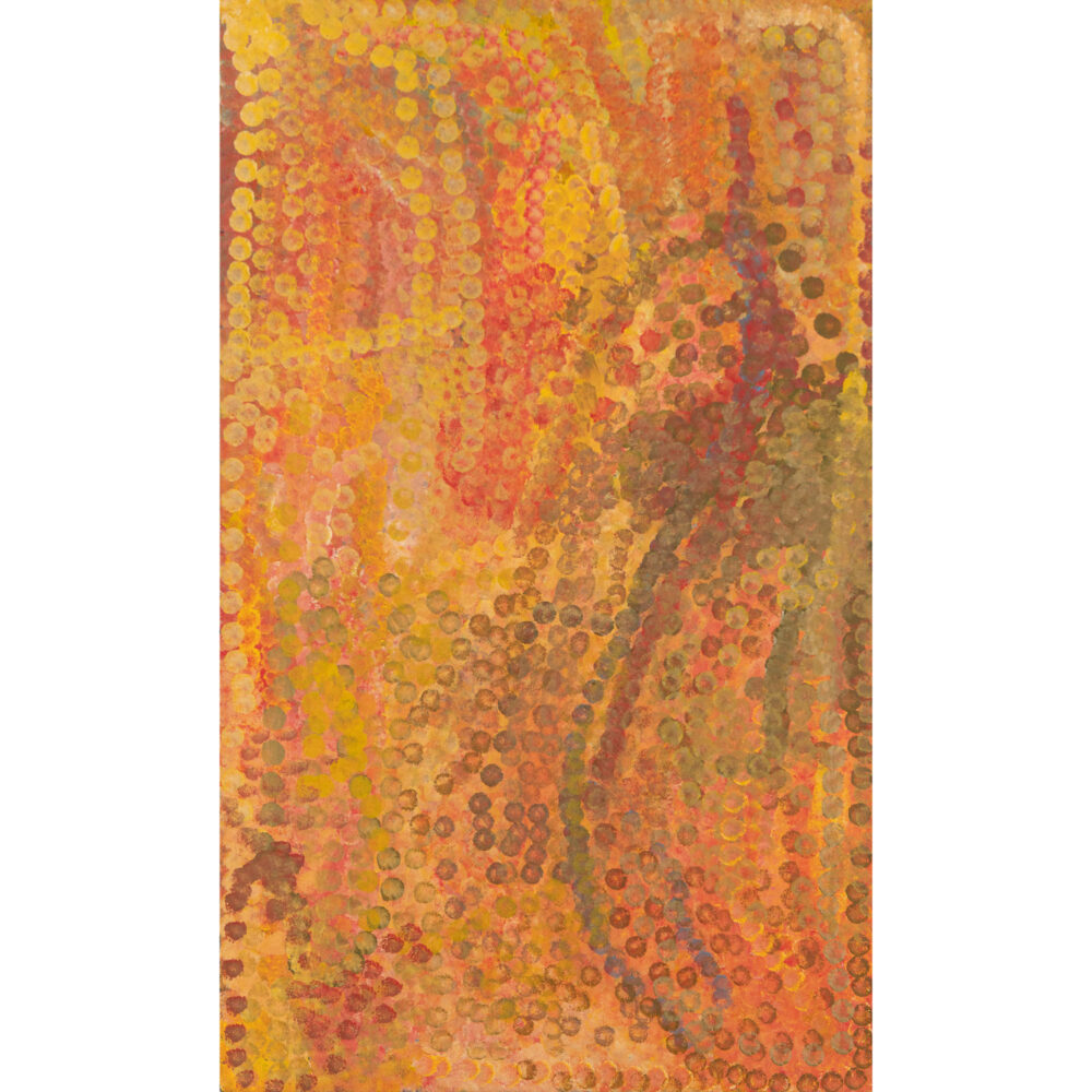 One reading of the work is the union between subgroups of the Dhalwangu clan during regular fishtrap ceremonies, the last of which occurred in 2018. The sacred diamond designs, generally referring to the waters around Gängän, are encased in a strong grid of vertical and horizontal lines representing the fishtrap structure made during Mirrawarr (early Dry Season) from Rangan (paperbark) and wooden stakes. This Buyku, or fishtrap area, is ‘company’ land – shared by all who live by and sing the river. Participants in this song cycle and fishing activity hunt Baypinga (Saratoga), as does the Gany’tjurr (Reef Heron), the archetypal Yirritja hunter.