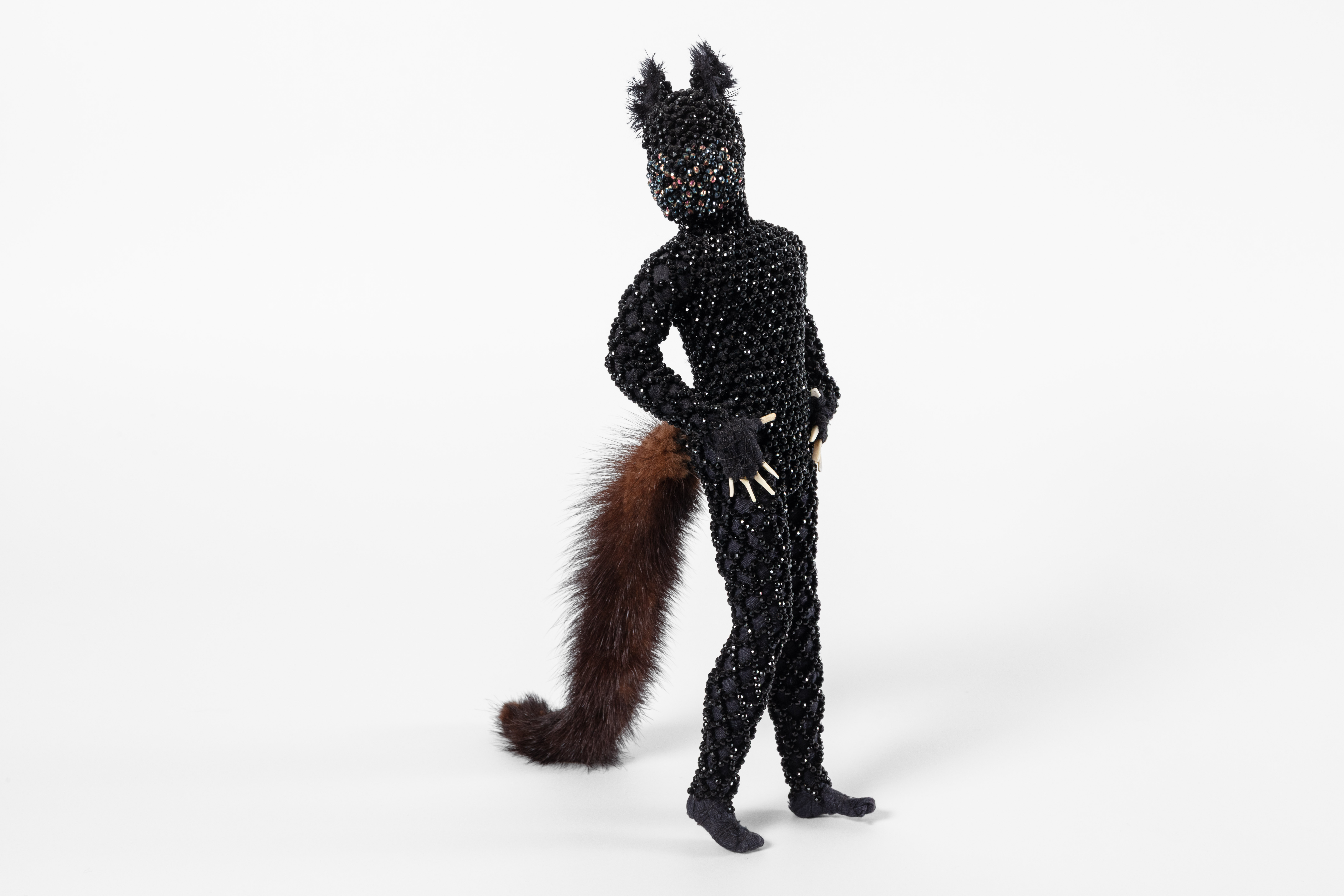 steel, acrylic resin, dyed cotton, black spinel, mink fur, bird bones