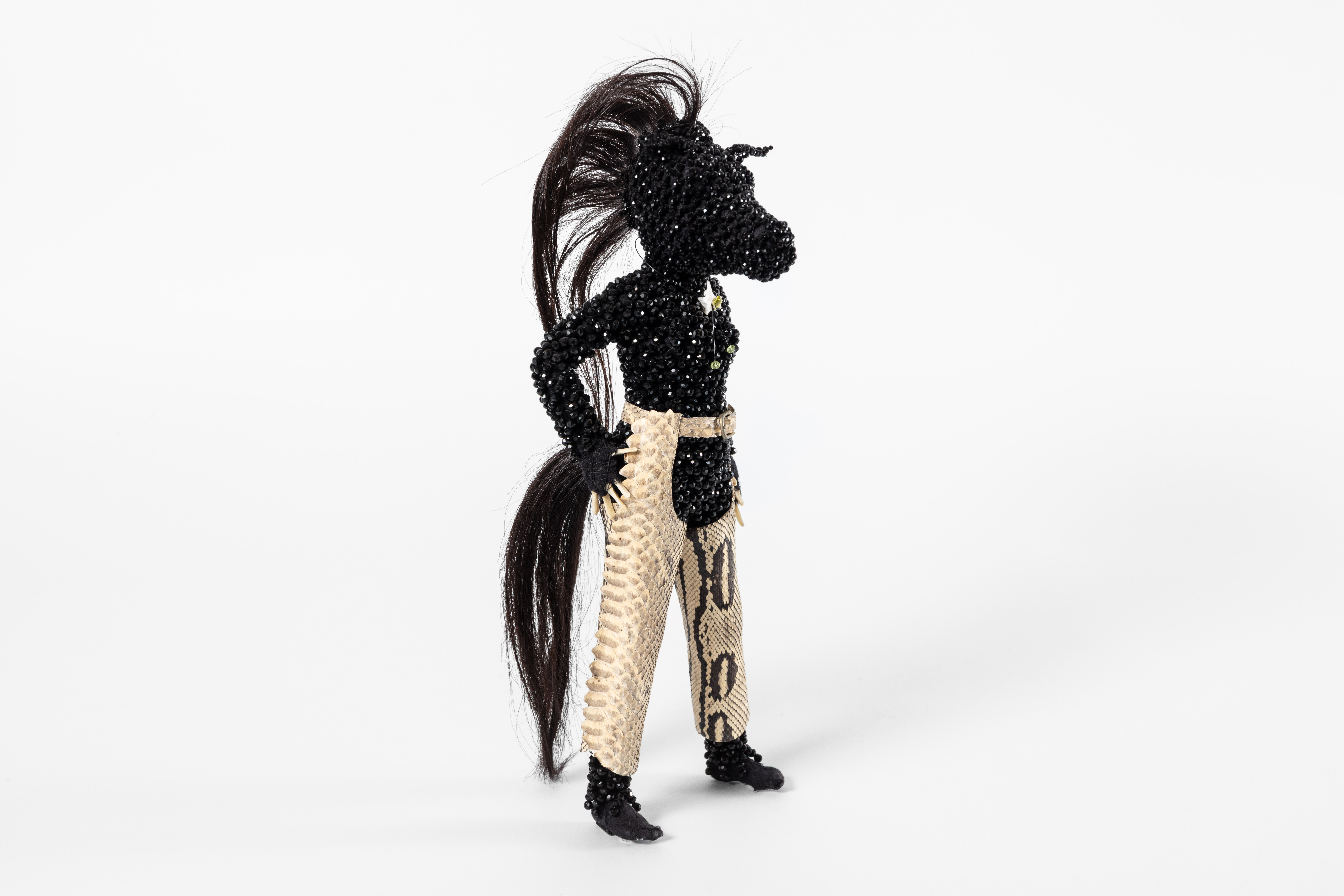 steel, acrylic resin, dyed cotton, black spinel, human hair, snake skin, mink, bird and snake bones, peridot